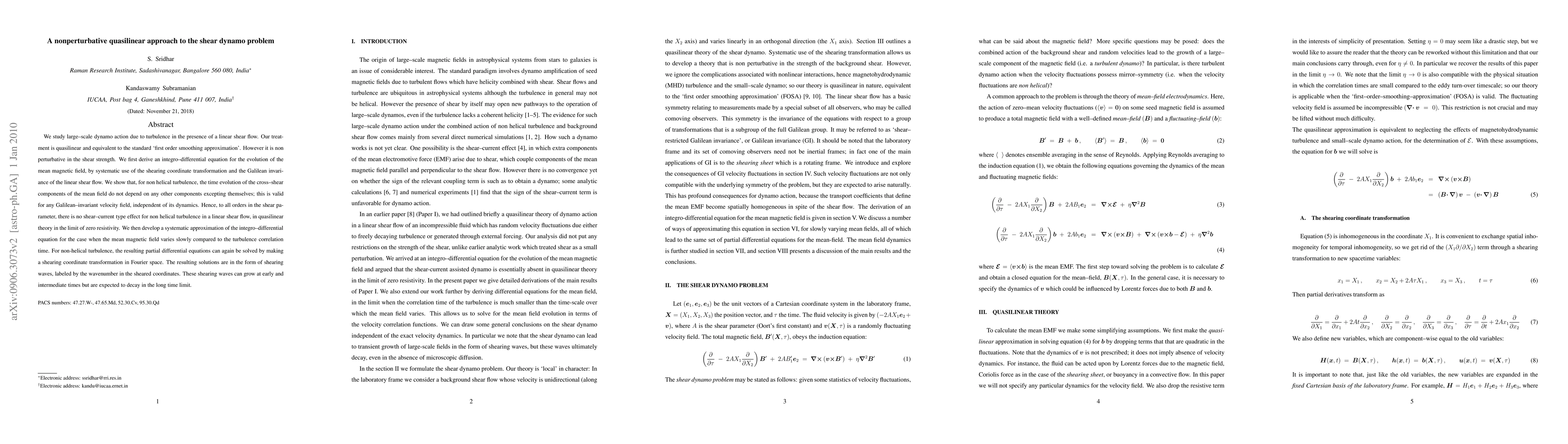 This paper develops a nonperturbative quasilinear approach to study the large-scale dynamo action in turbulent flows with linear shear, deriving an integro-differential equation for mean magnetic field evolution. It finds that non-helical turbulence does not exhibit shear-current effects and presents solutions in the form of shearing waves that may grow initially but decay over time.