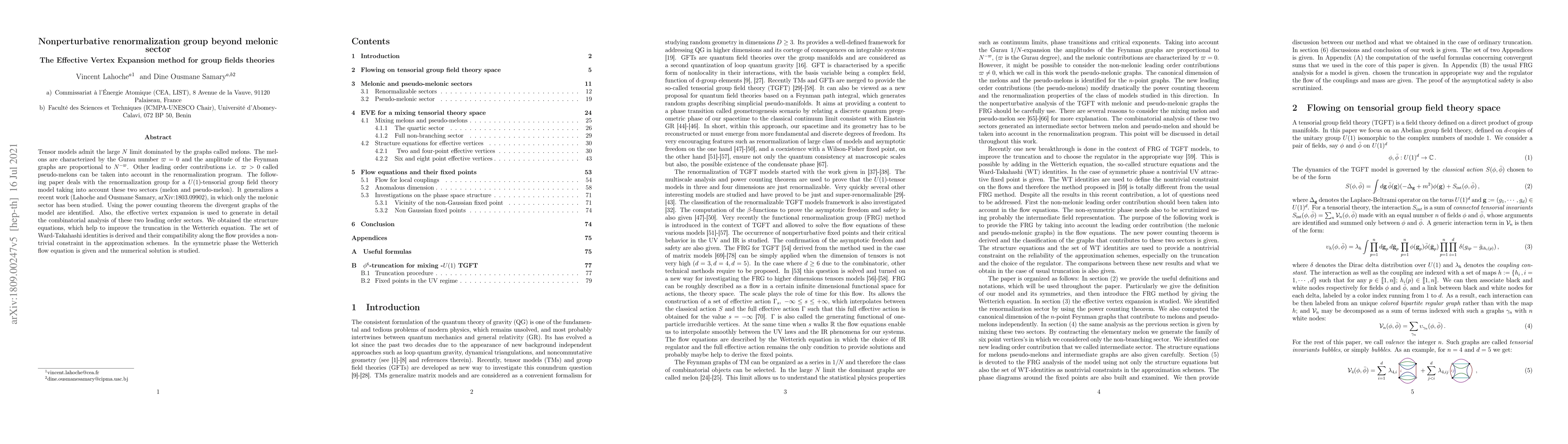 This paper develops a new method for studying group field theories beyond melonic sectors, using an effective vertex expansion to analyze leading-order contributions and deriving structure equations that improve truncation in the Wetterich equation.
