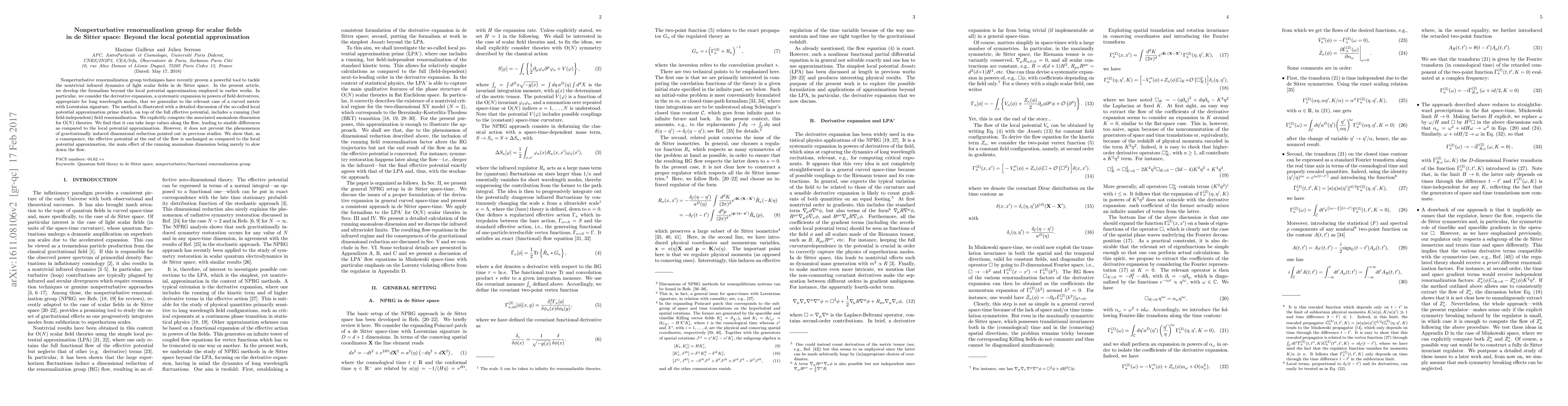 Nonperturbative renormalization group techniques have recently proven a powerful tool to tackle the nontrivial infrared dynamics of light scalar fields in de Sitter space. In the present article, we develop the formalism beyond the local potential approximation employed in earlier works. In particular, we consider the derivative expansion, a systematic expansion in powers of field derivatives, appropriate for long wavelength modes, that we generalize to the relevant case of a curved metric with Lorentzian signature. The method is illustrated with a detailed discussion of the so-called local potential approximation prime which, on top of the full effective potential, includes a running (but field-independent) field renormalization. We explicitly compute the associated anomalous dimension for O(N) theories. We find that it can take large values along the flow, leading to sizable differences as compared to the local potential approximation. However, it does not prevent the phenomenon of gravitationally induced dimensional reduction pointed out in previous studies. We show that, as a consequence, the effective potential at the end of the flow is unchanged as compared to the local potential approximation, the main effect of the running anomalous dimension being merely to slow down the flow.