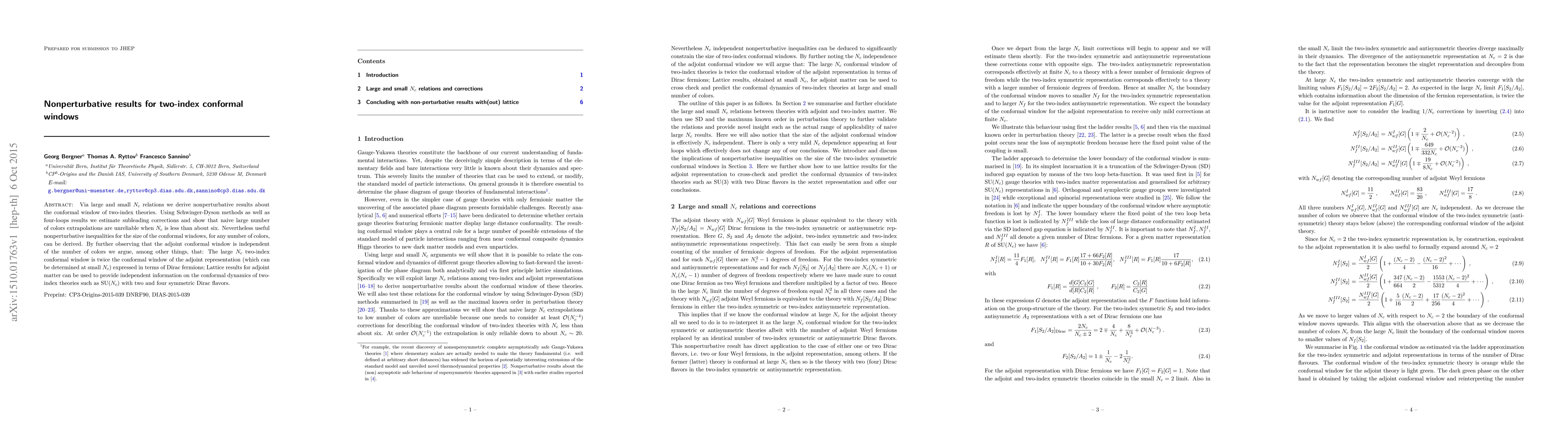 Via large and small $N_c$ relations we derive nonperturbative results about the conformal window of two-index theories. Using Schwinger-Dyson methods as well as four-loops results we estimate subleading corrections and show that naive large number of colors extrapolations are unreliable when $N_c$ is less than about six. Nevertheless useful nonperturbative inequalities for the size of the conformal windows, for any number of colors, can be derived. By further observing that the adjoint conformal window is independent of the number of colors we argue, among other things, that: The large $N_c$ two-index conformal window is twice the conformal window of the adjoint representation (which can be determined at small $N_c$) expressed in terms of Dirac fermions; Lattice results for adjoint matter can be used to provide independent information on the conformal dynamics of two-index theories such as SU($N_c$) with two and four symmetric Dirac flavors.