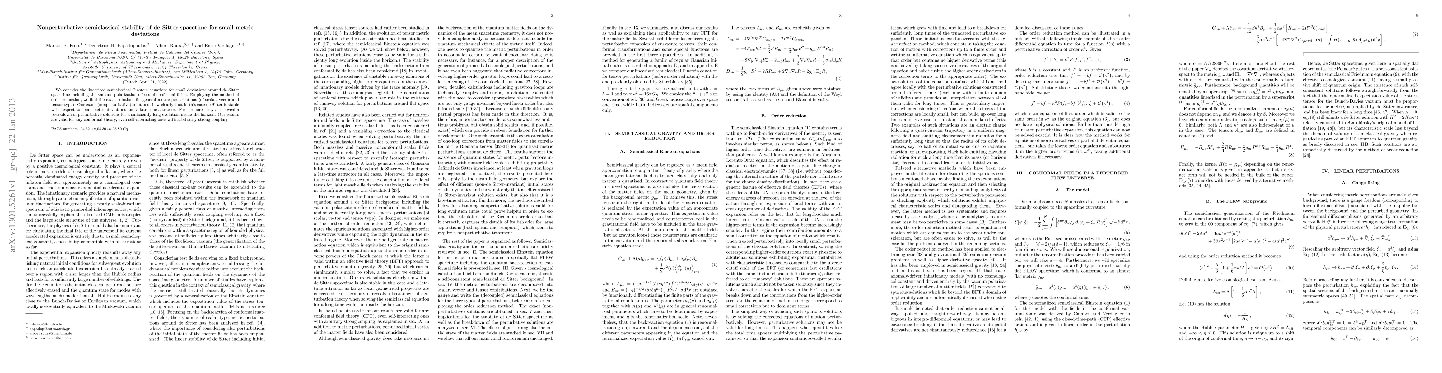 This paper explores the stability of de Sitter spacetime under small metric perturbations, including vacuum polarization effects from conformal fields. Exact nonperturbative solutions reveal that de Sitter is stable for small deviations, acting as a late-time attractor, while perturbative methods fail for long evolutions within the horizon.