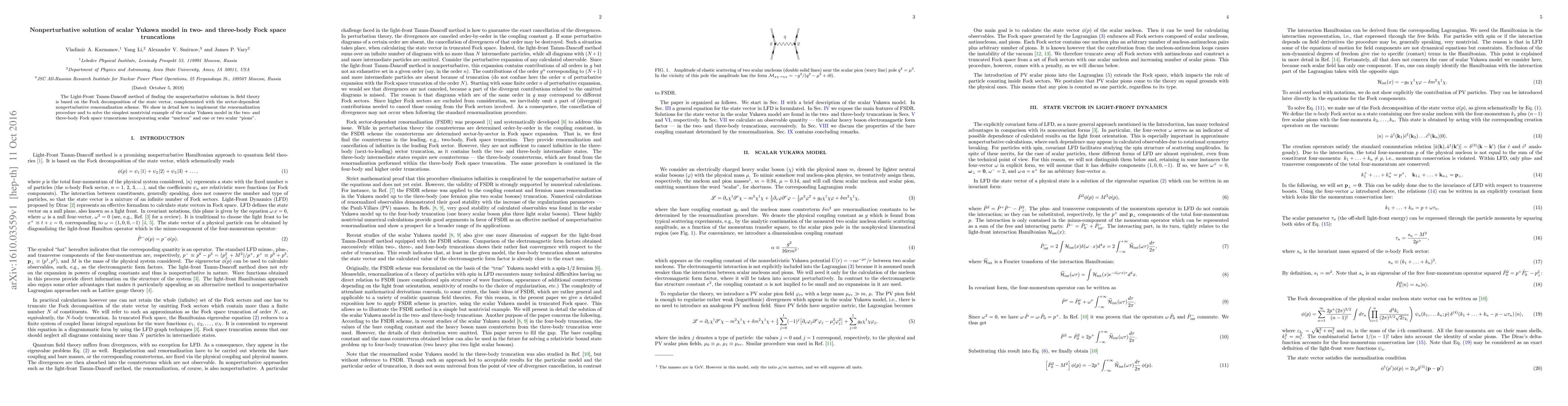 This paper presents a nonperturbative solution for the scalar Yukawa model using the Light-Front Tamm-Dancoff method, focusing on two- and three-body Fock space truncations. It details the renormalization procedure and solves the model incorporating scalar nucleons and pions.