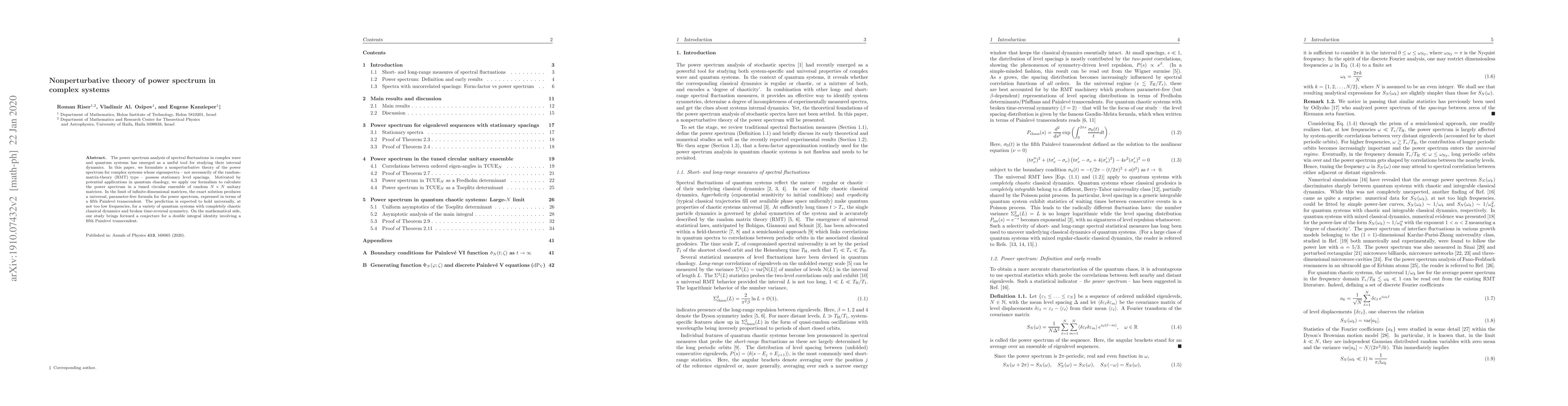 This research presents a nonperturbative theory for the power spectrum in complex systems, applicable to chaotic quantum systems. It derives a universal, parameter-free formula for the power spectrum in the infinite-dimensional limit, expressed via a fifth Painlevé transcendent, with potential broad implications in quantum chaology.