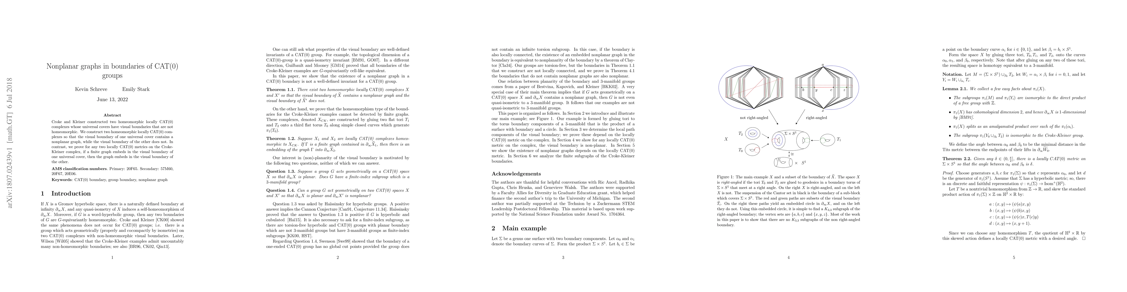 This paper constructs two homeomorphic locally CAT(0) complexes where the visual boundary of one contains a nonplanar graph, while the other does not, contrasting with the embeddability of finite graphs in the boundaries of any two locally CAT(0) metrics on the Croke-Kleiner complex.