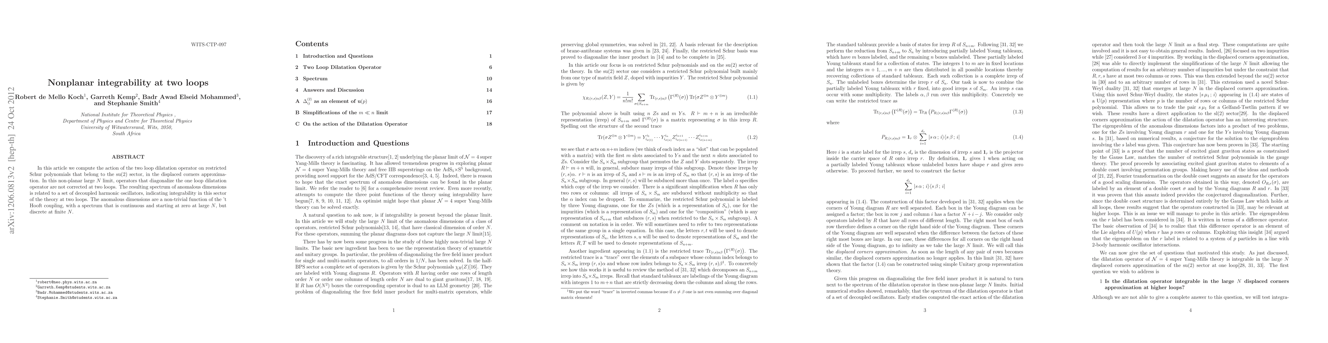In this article we compute the action of the two loop dilatation operator on restricted Schur polynomials that belong to the su(2) sector, in the displaced corners approximation. In this non-planar large N limit, operators that diagonalize the one loop dilatation operator are not corrected at two loops. The resulting spectrum of anomalous dimensions is related to a set of decoupled harmonic oscillators, indicating integrability in this sector of the theory at two loops. The anomalous dimensions are a non-trivial function of the 't Hooft coupling, with a spectrum that is continuous and starting at zero at large N, but discrete at finite N.
