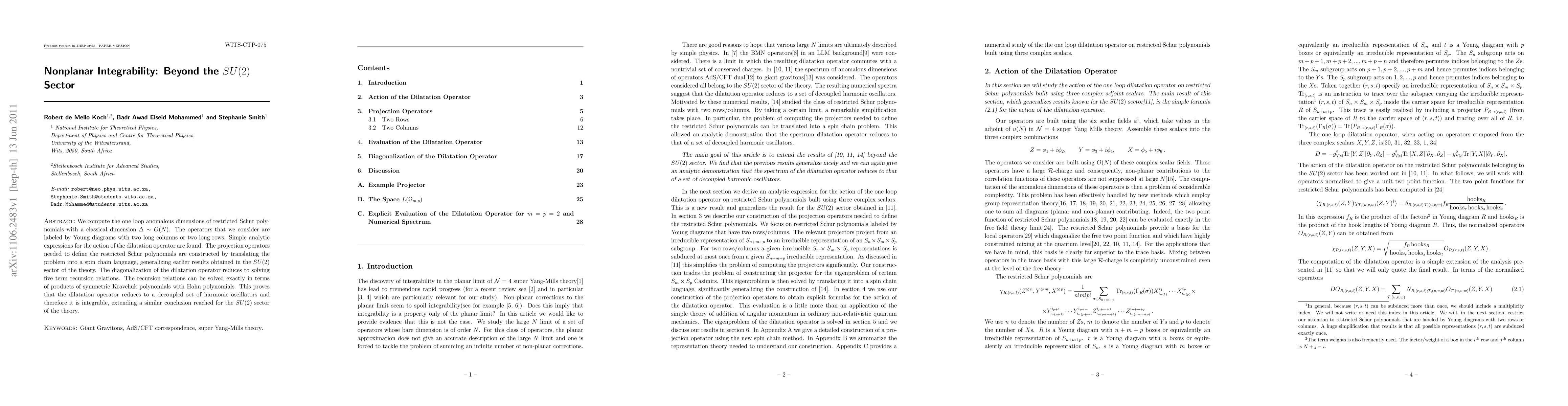 We compute the one loop anomalous dimensions of restricted Schur polynomials with a classical dimension \Delta\sim O(N). The operators that we consider are labeled by Young diagrams with two long columns or two long rows. Simple analytic expressions for the action of the dilatation operator are found. The projection operators needed to define the restricted Schur polynomials are constructed by translating the problem into a spin chain language, generalizing earlier results obtained in the SU(2) sector of the theory. The diagonalization of the dilatation operator reduces to solving five term recursion relations. The recursion relations can be solved exactly in terms of products of symmetric Kravchuk polynomials with Hahn polynomials. This proves that the dilatation operator reduces to a decoupled set of harmonic oscillators and therefore it is integrable, extending a similar conclusion reached for the SU(2) sector of the theory.