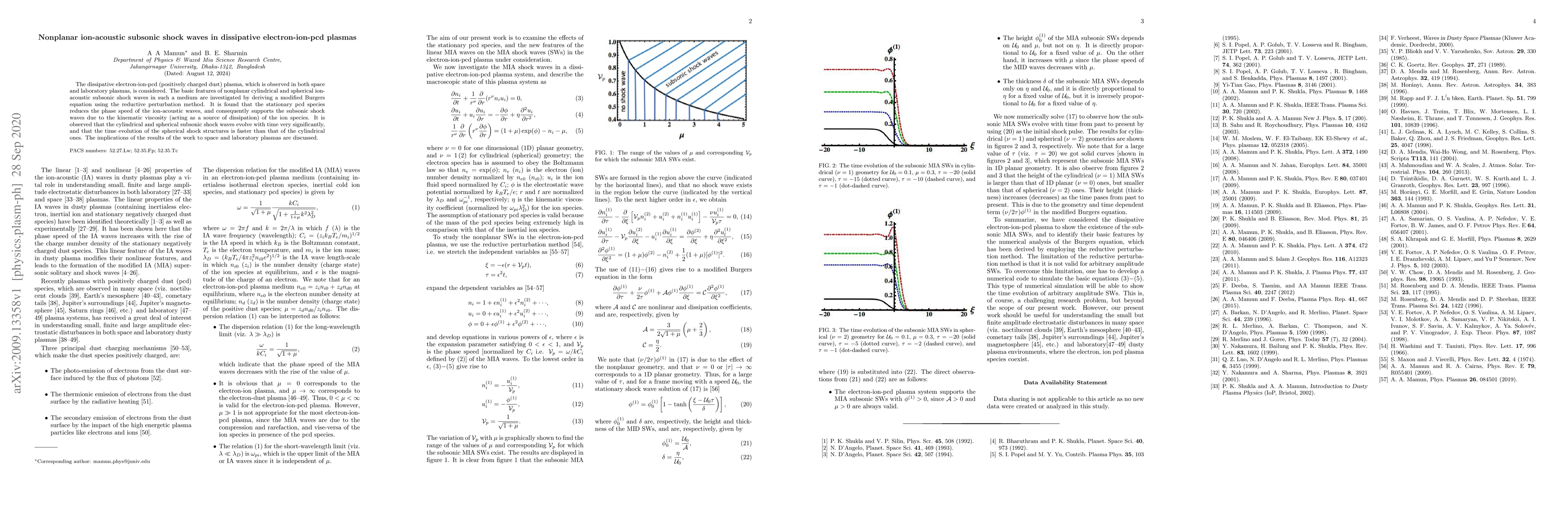 This paper investigates nonplanar ion-acoustic subsonic shock waves in dissipative electron-ion-pcd plasmas, deriving a modified Burgers equation to analyze their behavior. The study finds that positively charged dust particles reduce the phase speed of ion-acoustic waves, supporting subsonic shock waves due to kinematic viscosity, with spherical shock structures evolving faster than cylindrical ones.