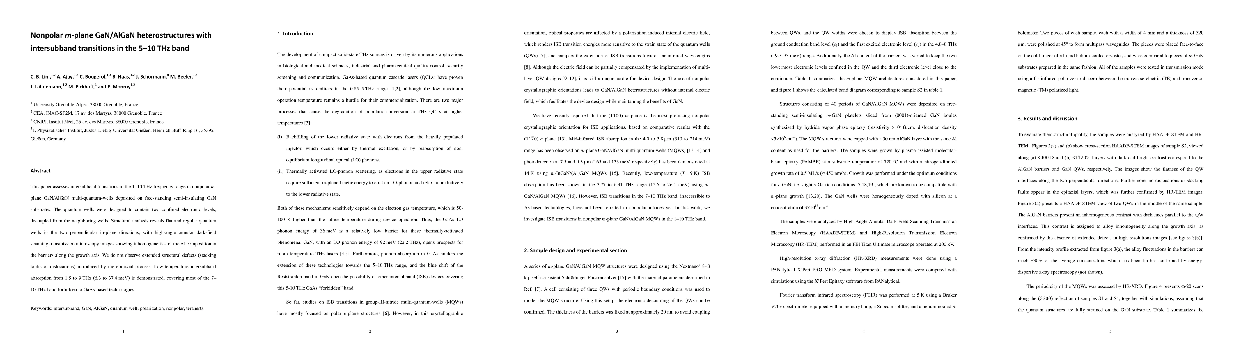 This paper investigates intersubband transitions in nonpolar m-plane GaN/AlGaN quantum wells, demonstrating absorption from 1.5 to 9 THz, including frequencies in the 7 to 10 THz band, which are inaccessible to GaAs-based technologies. Structural analysis shows flat quantum wells with minor Al composition inhomogeneities, no extended defects.