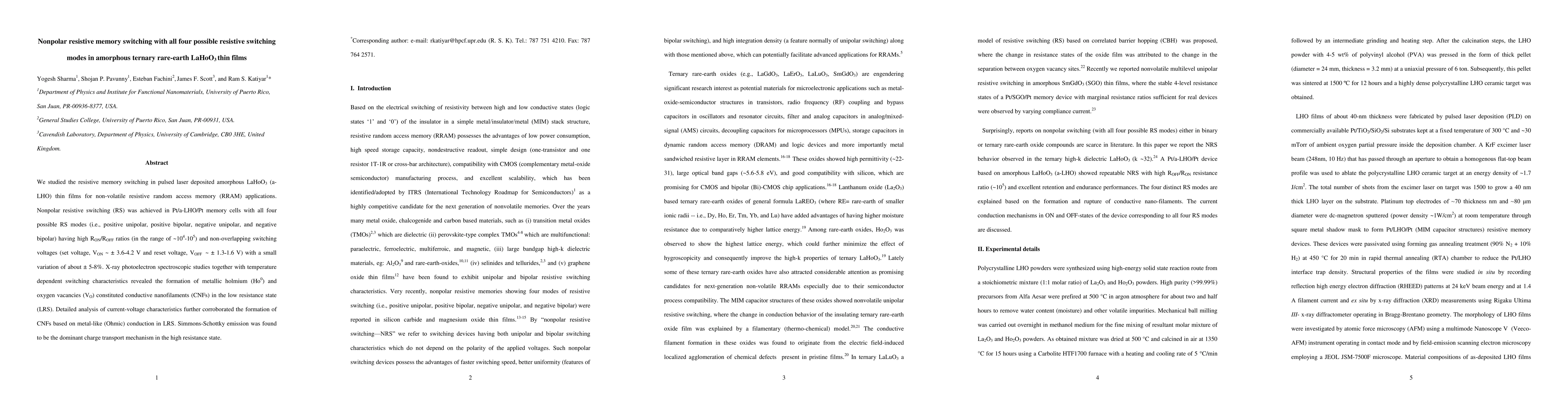 This study investigates resistive memory switching in amorphous LaHoO3 thin films for RRAM applications, achieving all four resistive switching modes with high RON/ROFF ratios and non-overlapping switching voltages. Conductive nanofilaments formed by metallic holmium and oxygen vacancies are identified as the cause of low resistance state conduction.
