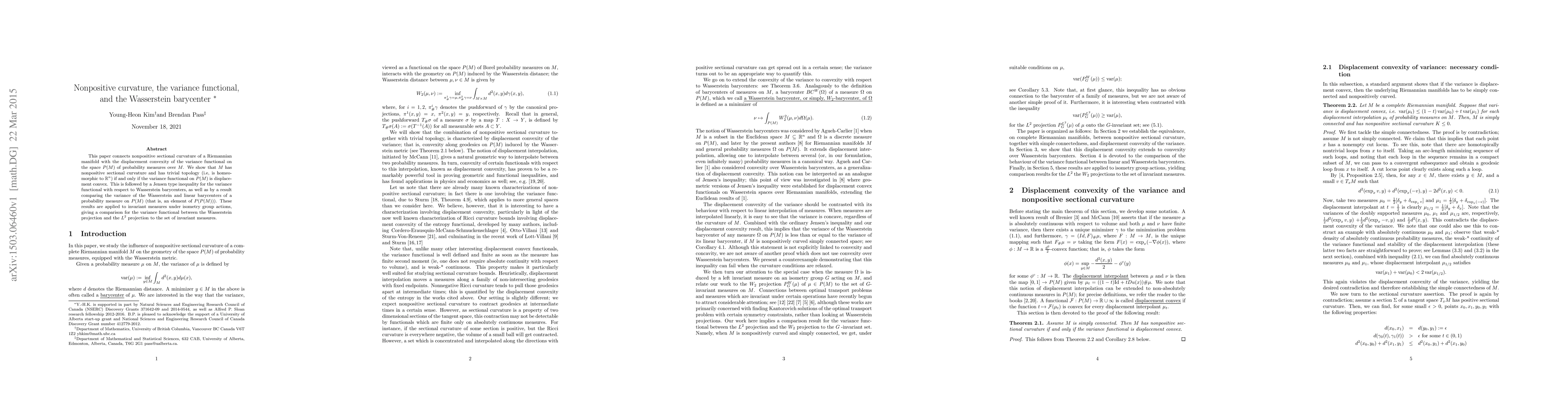 A study connects nonpositive sectional curvature of a Riemannian manifold to the displacement convexity of variance functional on probability measures, establishing key results for Wasserstein barycenters and invariant measures.