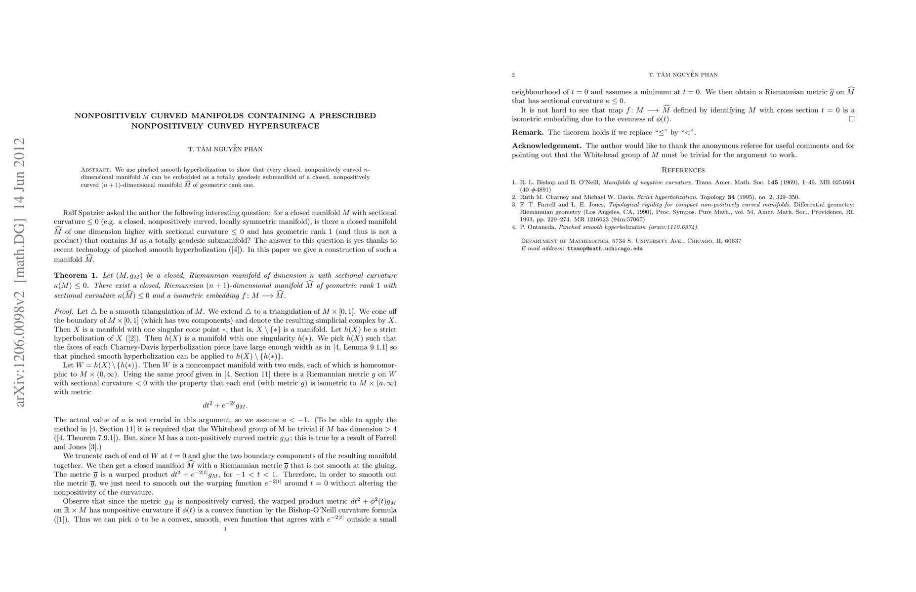 Summary: The paper demonstrates that any closed, nonpositively curved $n$-dimensional manifold can be embedded as a totally geodesic submanifold within a larger closed, nonpositively curved $(n+1)$-dimensional manifold using a technique called pinched smooth hyperbolization. This method preserves the geometric rank one property.