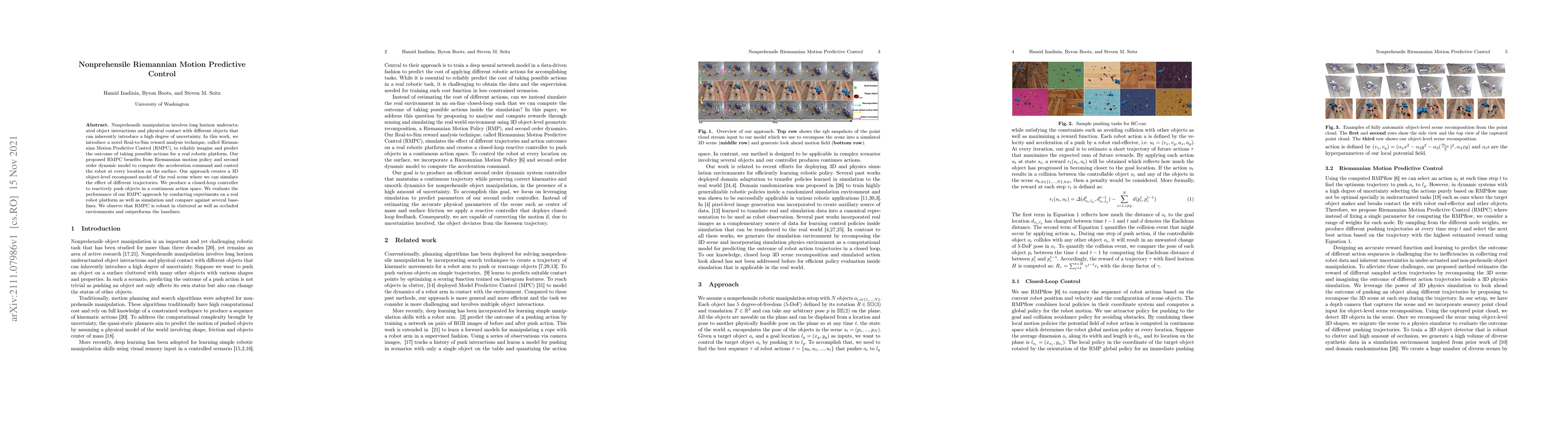 Nonprehensile manipulation involves long horizon underactuated object interactions and physical contact with different objects that can inherently introduce a high degree of uncertainty. In this work, we introduce a novel Real-to-Sim reward analysis technique, called Riemannian Motion Predictive Control (RMPC), to reliably imagine and predict the outcome of taking possible actions for a real robotic platform. Our proposed RMPC benefits from Riemannian motion policy and second order dynamic model to compute the acceleration command and control the robot at every location on the surface. Our approach creates a 3D object-level recomposed model of the real scene where we can simulate the effect of different trajectories. We produce a closed-loop controller to reactively push objects in a continuous action space. We evaluate the performance of our RMPC approach by conducting experiments on a real robot platform as well as simulation and compare against several baselines. We observe that RMPC is robust in cluttered as well as occluded environments and outperforms the baselines.