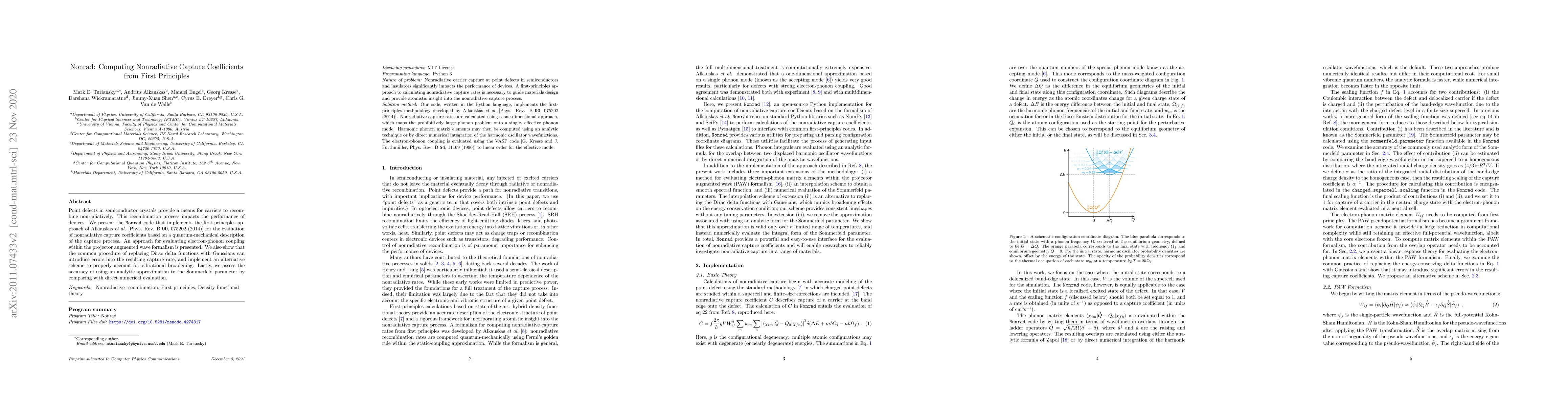 The Nonrad code and the method for computing nonradiative capture coefficients from first principles, including the electron-phonon coupling approach within the PAW formalism and the alternative scheme for vibrational broadening.