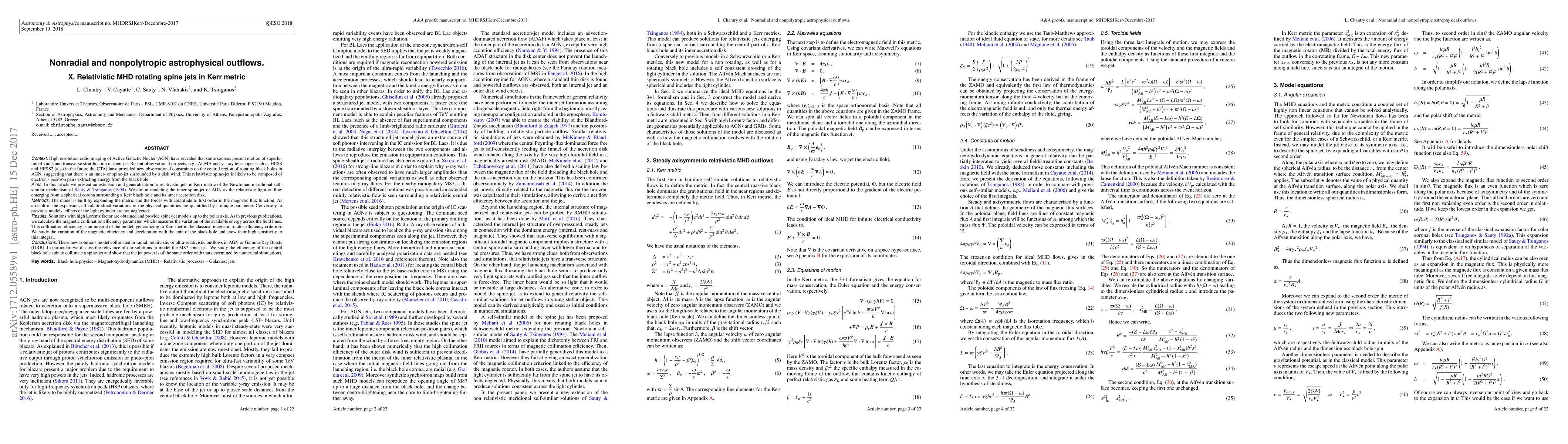High resolution radio imaging of AGN have revealed that some sources present motion of superluminal knots and transverse stratification of their jet. Recent observational projects have provided new observational constraints on the central region of rotating black holes in AGN, suggesting that there is an inner- or spine-jet surrounded by a disk wind. This relativistic spine-jet is likely to be composed of electron - positron pairs extracting energy from the black hole. In this article we present an extension and generalization to relativistic jets in Kerr metric of the meridional self similar mechanism. We aim at modeling the inner spine-jet of AGN as the relativistic light outflow emerging from a spherical corona surrounding a Kerr black hole. The model is built by expanding the metric and the forces with colatitude to first order in the magnetic flux function. Conversely to previous models, effects of the light cylinder are not neglected. Solutions with high Lorentz factor are obtained and provide spine-jet models up to the polar axis. As in previous publications, we calculate the magnetic collimation efficiency parameter, which measures the variation of the available energy across the field lines. This collimation efficiency is an integral of the model, generalizing to Kerr metric the classical magnetic rotator efficiency criterion. We study the variation of the magnetic efficiency and acceleration with the spin of the black hole and show their high sensitivity to this integral. These new solutions model collimated or radial, relativistic or ultra-relativistic outflows. We discuss the relevance of our solutions to model the M87 spine-jet. We study the efficiency of the central black hole spin to collimate a spine-jet and show that the jet power is of the same order with that determined by numerical simulations.