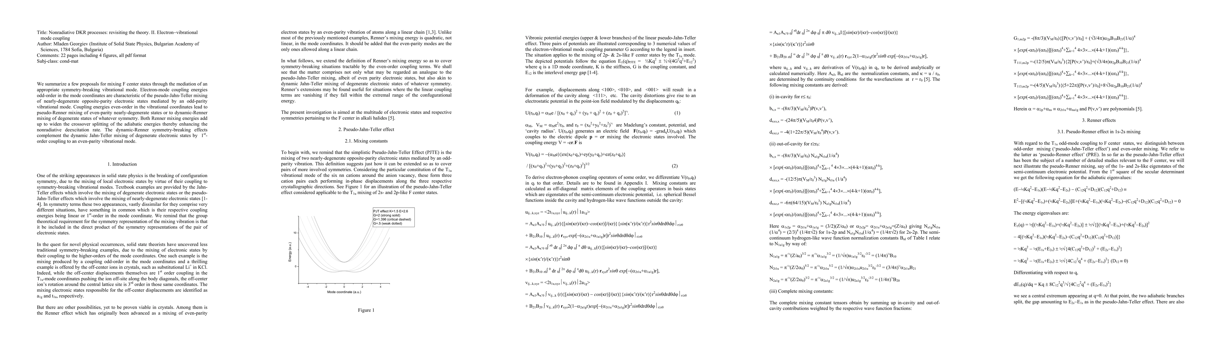 This paper revisits the theory of nonradiative DKR processes, focusing on electron-vibrational mode coupling. It proposes mechanisms for mixing F center states via symmetry-breaking vibrational modes, highlighting the role of odd- and even-order coupling energies in pseudo-Jahn-Teller and pseudo-Renner/dynamic-Renner mixing, respectively, to enhance the nonradiative deexcitation rate.