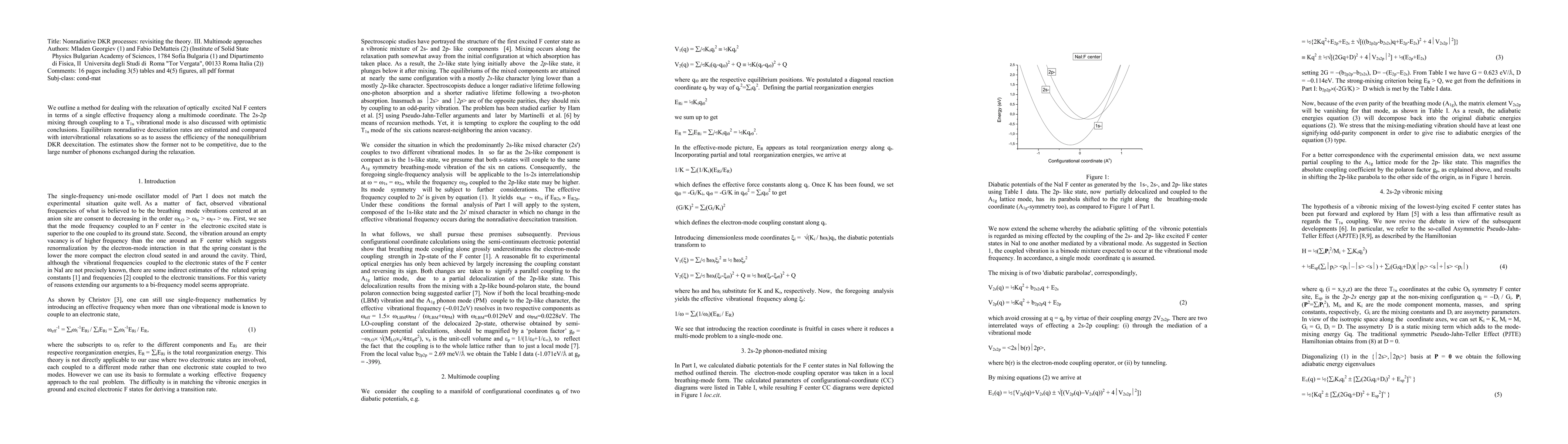 We outline a method for dealing with the relaxation of optically excited NaI F centers in terms of a single effective frequency along a multimode coordinate. The 2s-2p mixing through coupling to a T_{1u} vibrational mode is also discussed with optimistic conclusions. Equilibrium nonradiative deexcitation rates are estimated and compared with intervibrational relaxations so as to assess the efficiency of the nonequilibrium DKR deexcitation. They show the former not to be competitive, due to the large number of phonons exchanged.