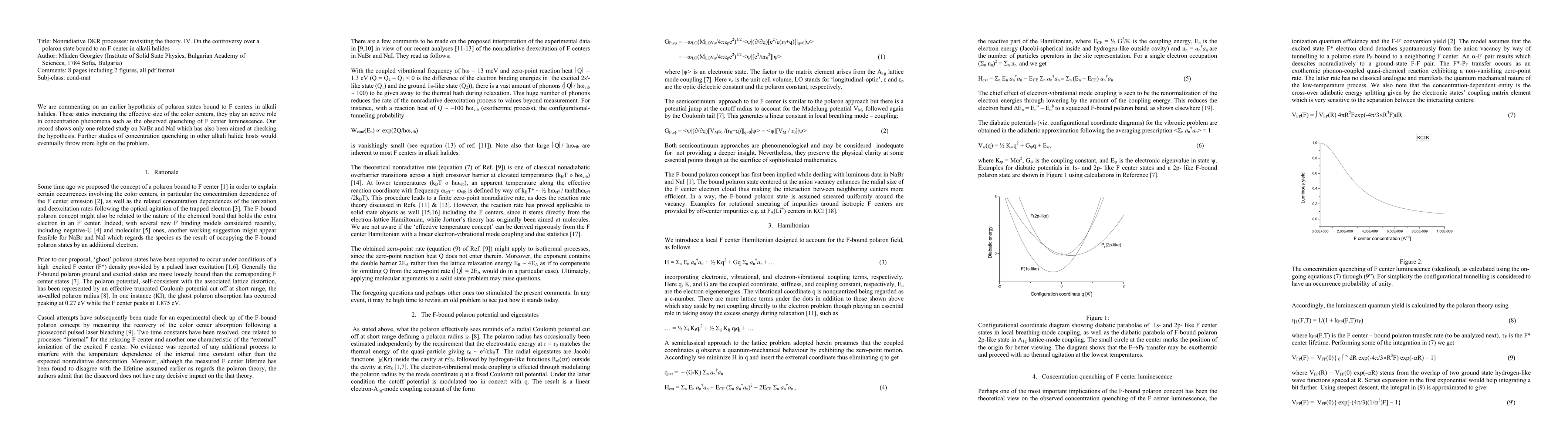 This paper revisits the theory of polaron states bound to F centers in alkali halides, emphasizing their role in concentration-dependent phenomena like the quenching of F center luminescence. It highlights the need for further studies in various alkali halide hosts to clarify the hypothesis.