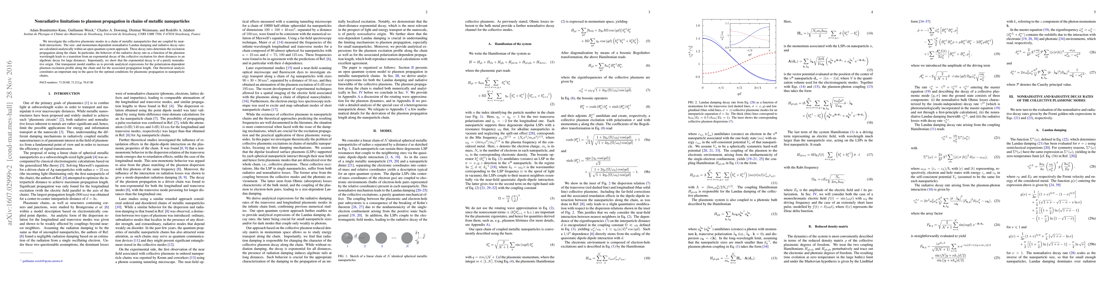This paper analytically investigates the nonradiative and radiative decay rates in plasmonic chains of metallic nanoparticles, revealing a transition from exponential to algebraic decay in excitation propagation. The study provides a transparent model for predicting the plasmon excitation profile and propagation length, crucial for optimizing plasmonic applications.