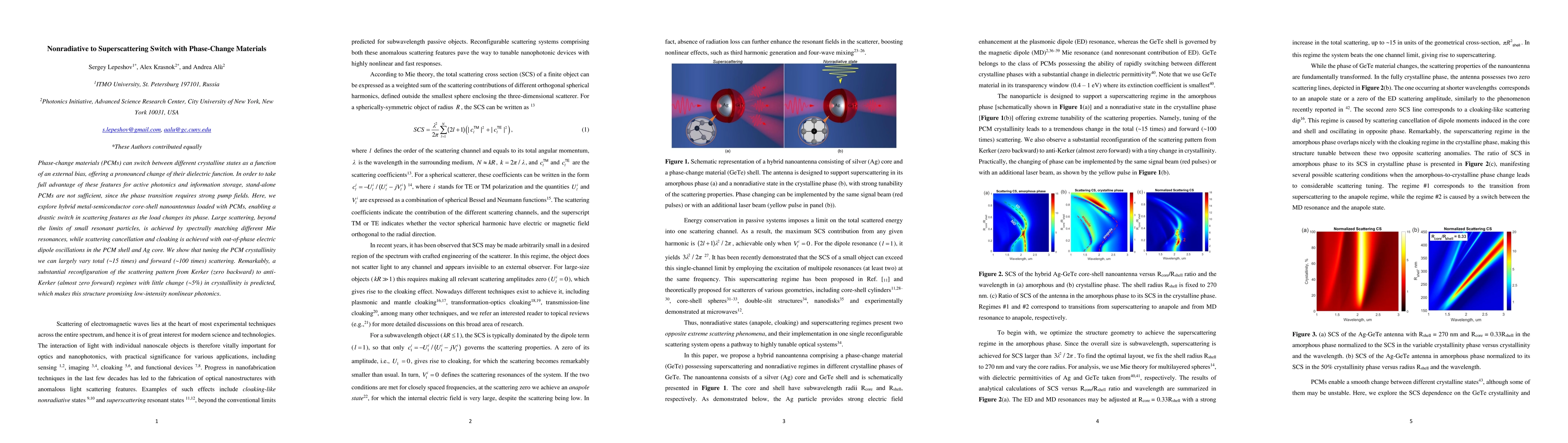 Phase-change materials (PCMs) can switch between different crystalline states as a function of an external bias, offering a pronounced change of their dielectric function. In order to take full advantage of these features for active photonics and information storage, stand-alone PCMs are not sufficient, since the phase transition requires strong pump fields. Here, we explore hybrid metal-semiconductor core-shell nanoantennas loaded with PCMs, enabling a drastic switch in scattering features as the load changes its phase. Large scattering, beyond the limits of small resonant particles, is achieved by spectrally matching different Mie resonances, while scattering cancellation and cloaking is achieved with out-of-phase electric dipole oscillations in the PCM shell and Ag core. We show that tuning the PCM crystallinity we can largely vary total (~15 times) and forward (~100 times) scattering. Remarkably, a substantial reconfiguration of the scattering pattern from Kerker (zero backward) to antiKerker (almost zero forward) regimes with little change (~5%) in crystallinity is predicted, which makes this structure promising low-intensity nonlinear photonics.