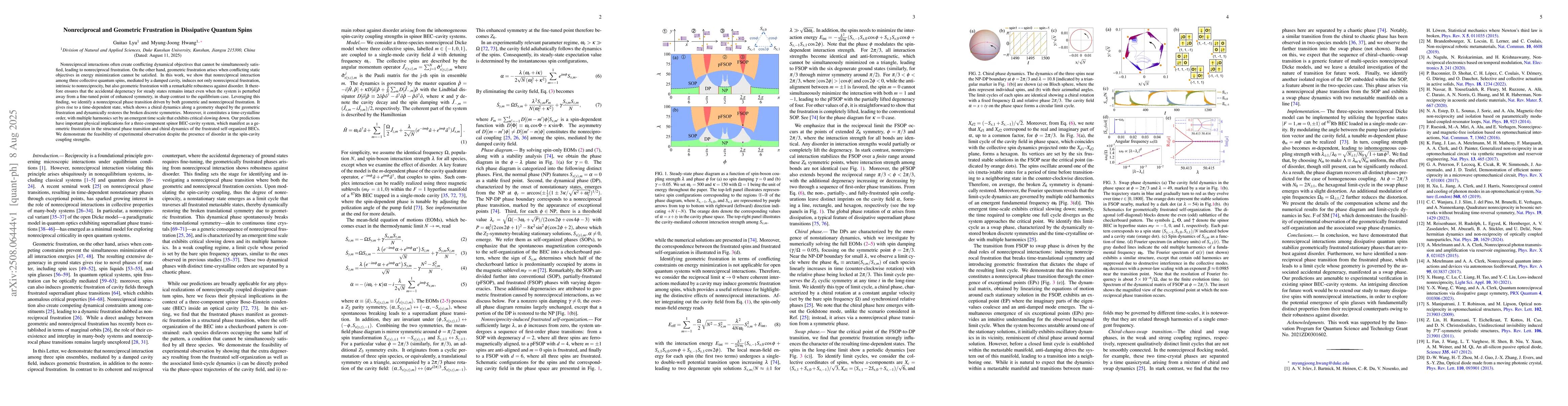 The paper presents a detailed analysis of nonreciprocal and geometric frustration in dissipative quantum spin systems, identifying a novel nonreciprocal phase transition and time-crystalline order.