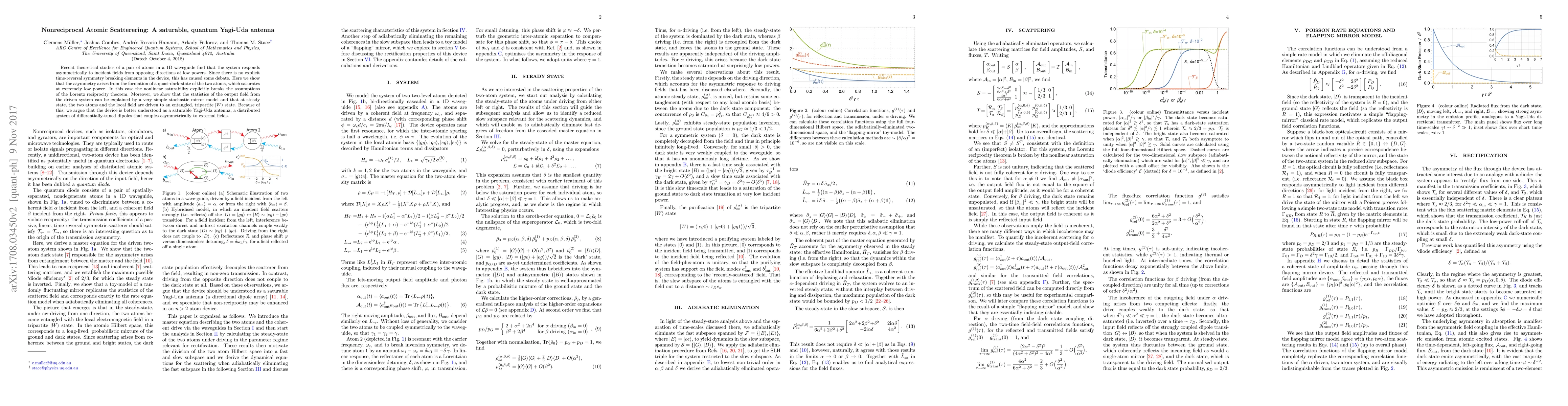 Recent theoretical studies of a pair of atoms in a 1D waveguide find that the system responds asymmetrically to incident fields from opposing directions at low powers. Since there is no explicit time-reversal symmetry breaking elements in the device, this has caused some debate. Here we show that the asymmetry arises from the formation of a quasi-dark-state of the two atoms, which saturates at extremely low power. In this case the nonlinear saturability explicitly breaks the assumptions of the Lorentz reciprocity theorem. Moreover, we show that the statistics of the output field from the driven system can be explained by a very simple stochastic mirror model and that at steady state, the two atoms and the local field are driven to an entangled, tripartite $\left| W \right\rangle$ state. Because of this, we argue that the device is better understood as a saturable Yagi-Uda antenna, a distributed system of differentially-tuned dipoles that couples asymmetrically to external fields.