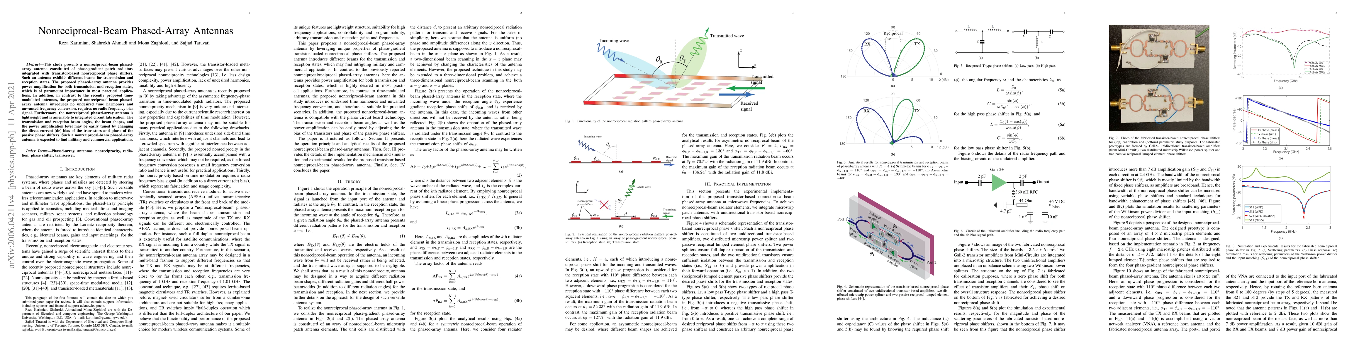 This study introduces a nonreciprocal-beam phased-array antenna with phase-gradient patch radiators and transistor-based phase shifters, enabling distinct transmission and reception beams without time harmonics or frequency conversion. It is lightweight, tunable, and suitable for integrated circuits, with potential military and commercial applications.
