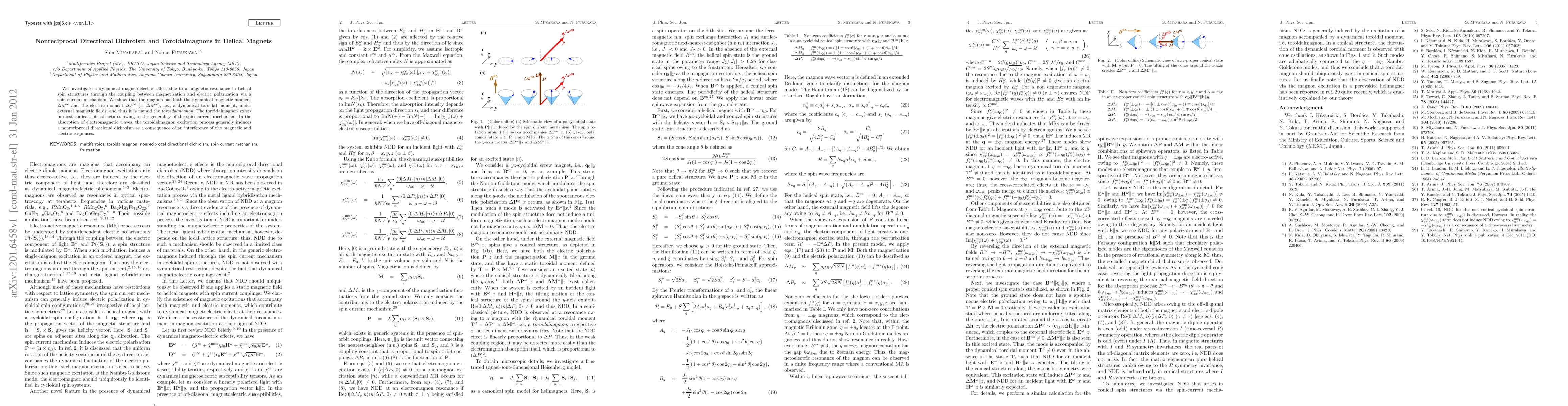 We investigate a dynamical magnetoelectric effect due to a magnetic resonance in helical spin structures through the coupling between magnetization and electric polarization via a spin current mechanism. We show that the magnon has both the dynamical magnetic moment $\Delta M^\omega$ and the electric moment $\Delta P^\omega$ ($\perp \Delta M^\omega$), i.e., a dynamical toroidal moment, under external magnetic fields, and thus it is named the {\em toroidalmagnon}. The toroidalmagnon exists in most conical spin structures owing to the generality of the spin current mechanism. In the absorption of electromagnetic waves, the toroidalmagnon excitation process generally induces a nonreciprocal directional dichroism as a consequence of an interference of the magnetic and electric responses.