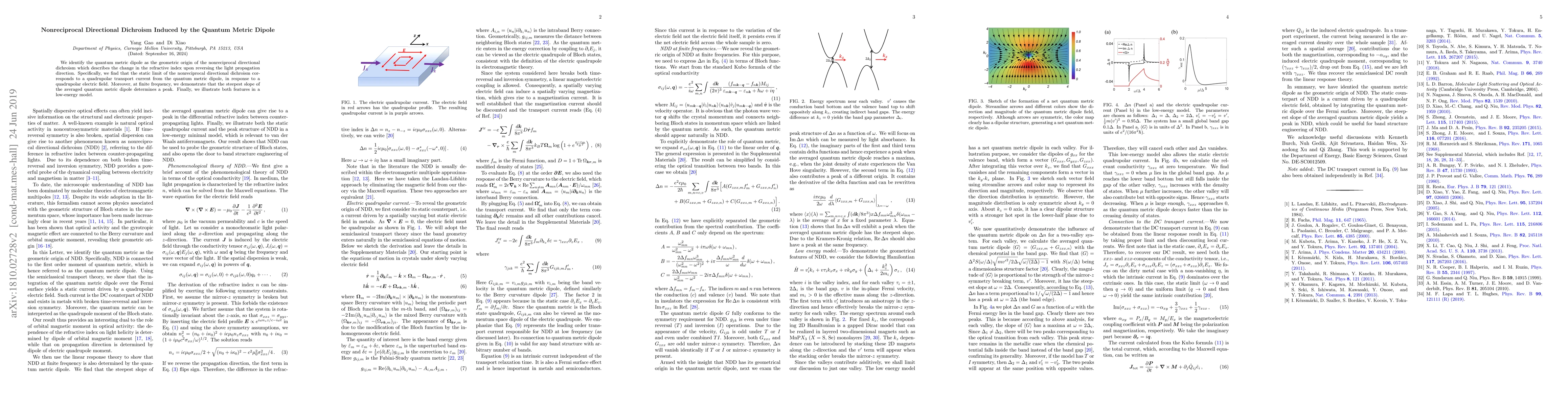 Researchers identify the quantum metric dipole as the origin of nonreciprocal directional dichroism in materials, which is influenced by quadrupolar electric fields and results in a change in refractive index upon reversing light direction.