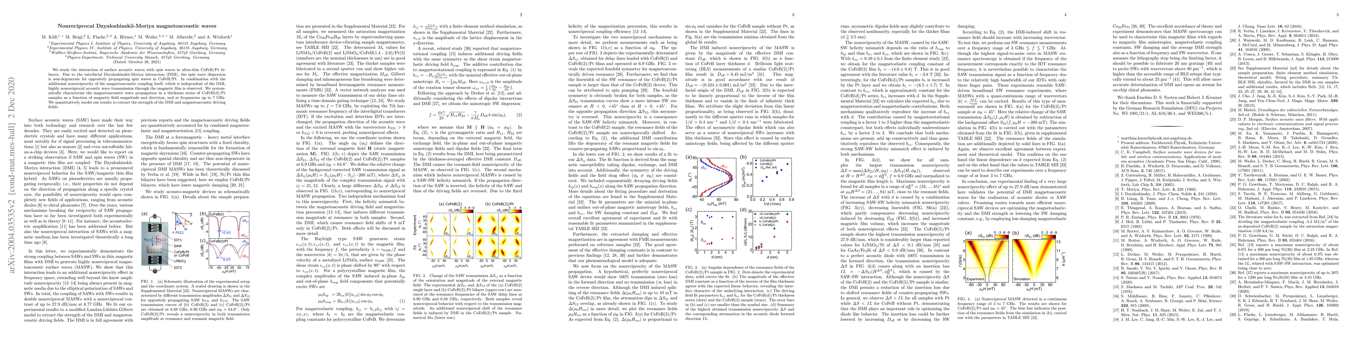 This research investigates the interaction between surface acoustic waves and spin waves in ultra-thin CoFeB/Pt bilayers, revealing highly nonreciprocal acoustic wave transmission due to Dzyaloshinskii-Moriya interaction and magnetoacoustic coupling. The study characterizes the magnetoacoustic wave propagation across various magnetic field conditions and up to 7 GHz, modeling the results to determine the DMI strength and magnetoacoustic driving fields.
