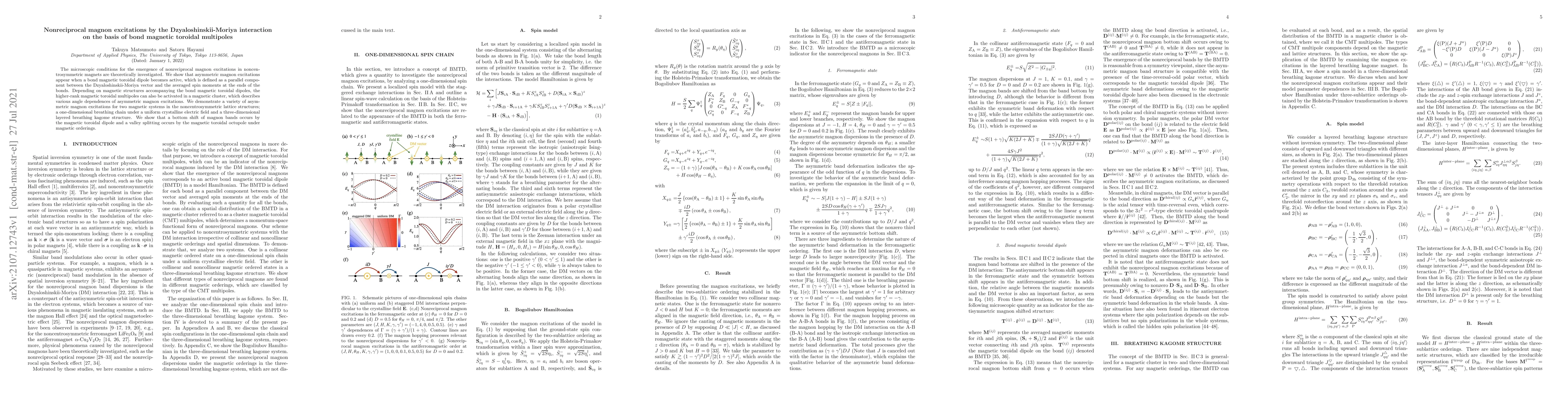 This paper investigates the conditions for nonreciprocal magnon excitations in noncentrosymmetric magnets, demonstrating that these arise due to bond magnetic toroidal dipoles activated by the Dzyaloshinskii-Moriya interaction, leading to asymmetric magnon excitations and various angle dependencies.