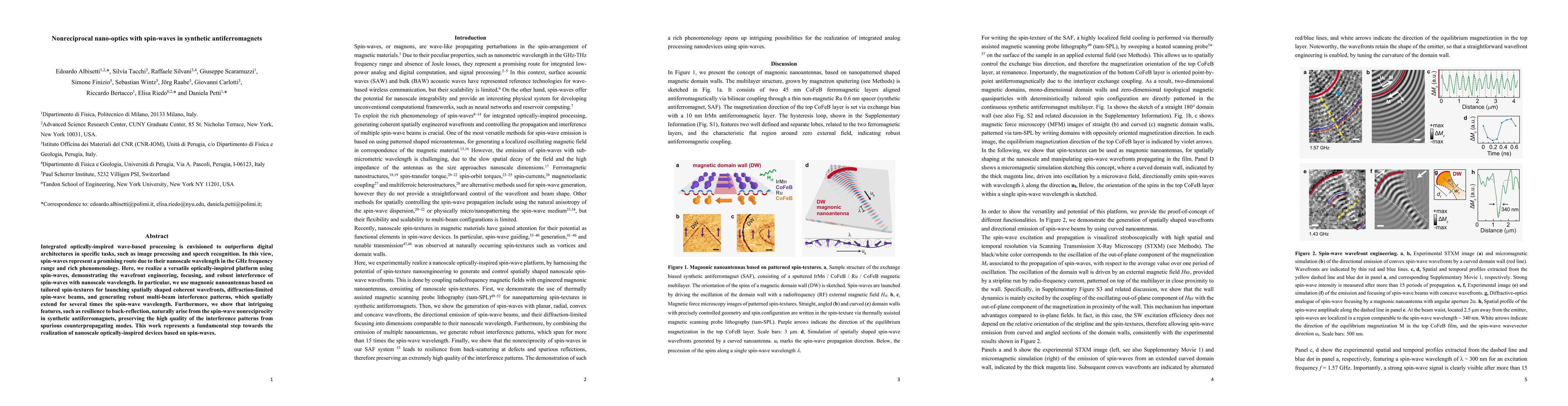 Integrated optically-inspired wave-based processing is envisioned to outperform digital architectures in specific tasks, such as image processing and speech recognition. In this view, spin-waves represent a promising route due to their nanoscale wavelength in the GHz frequency range and rich phenomenology. Here, we realize a versatile optically-inspired platform using spin-waves, demonstrating the wavefront engineering, focusing, and robust interference of spin-waves with nanoscale wavelength. In particular, we use magnonic nanoantennas based on tailored spin-textures for launching spatially shaped coherent wavefronts, diffraction-limited spin-wave beams, and generating robust multi-beam interference patterns, which spatially extend for several times the spin-wave wavelength. Furthermore, we show that intriguing features, such as resilience to back-reflection, naturally arise from the spin-wave nonreciprocity in synthetic antiferromagnets, preserving the high quality of the interference patterns from spurious counterpropagating modes. This work represents a fundamental step towards the realization of nanoscale optically-inspired devices based on spin-waves.