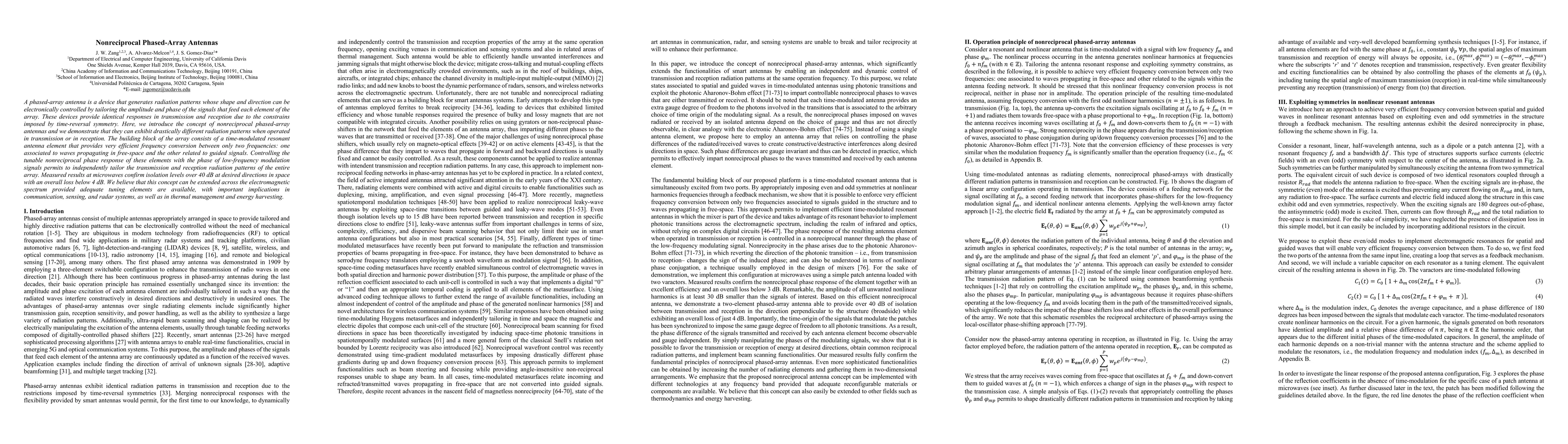 This paper introduces nonreciprocal phased-array antennas that can generate distinct radiation patterns for transmission and reception, achieved through time-modulated resonant elements facilitating frequency conversion and tunable phase response. Experimental results show high isolation levels and low losses, suggesting potential applications in various fields.