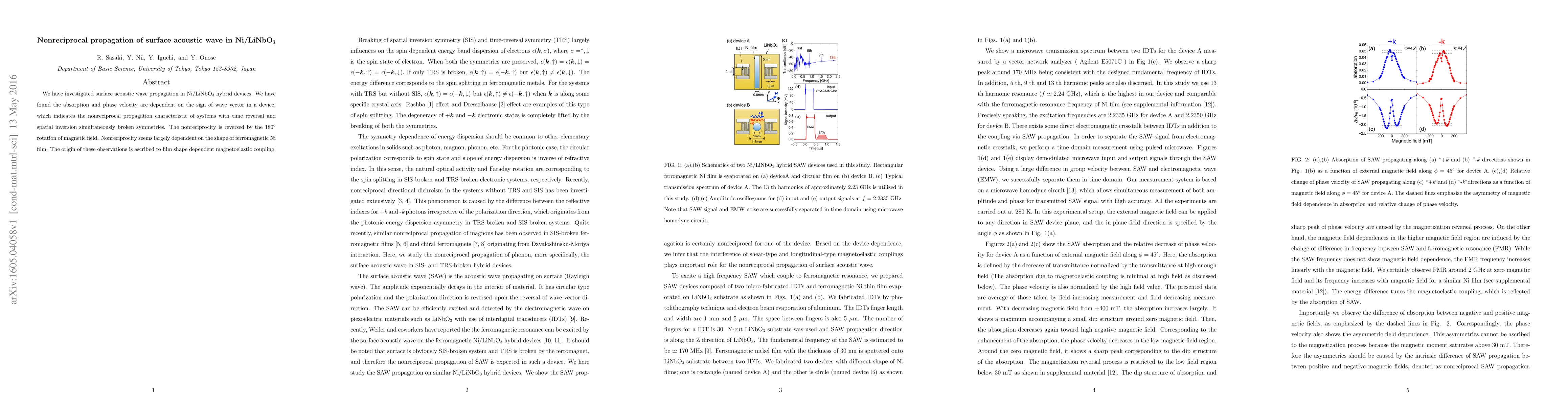 Researchers found that surface acoustic wave propagation in Ni/LiNbO3 devices exhibits nonreciprocal behavior, depending on the shape of the ferromagnetic Ni film and the direction of the magnetic field. This phenomenon is attributed to magnetoelastic coupling and is reversed by a 180-degree rotation of the magnetic field.