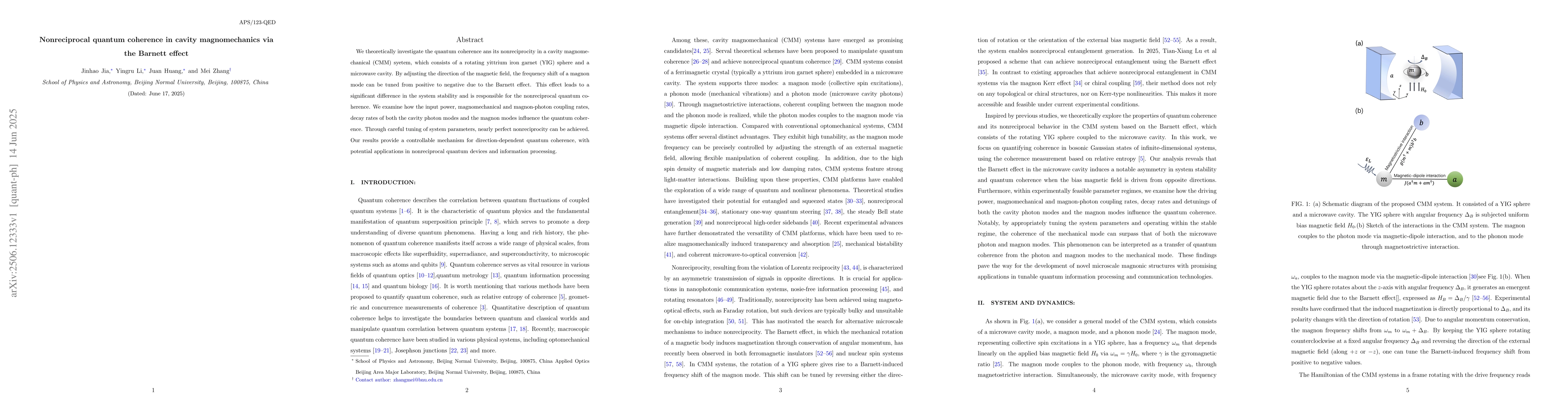 We theoretically investigate the quantum coherence ans its nonreciprocity in a cavity magnomechanical (CMM) syetem, which consists of a rotating yittrium iron garnet (YIG) sphere and a microwave cavity. By adjusting the direction of the magnetic field, the frequency shift of a magnon mode can be tuned from positive to negative due to the Barnett effect. This effect leads to a significant difference in the system stability and is responsible for the nonreciprocal quantum coherence. We examine how the input power, magnomechanical and magnon-photon coupling rates, decay rates of both the cavity photon modes and the magnon modes influence the quantum coherence. Through careful tuning of system parameters, nearly perfect nonreciprocity can be achieved. Our results provide a controllable mechanism for direction-dependent quantum coherence, with potential applications in nonreciprocal quantum devices and information processing.