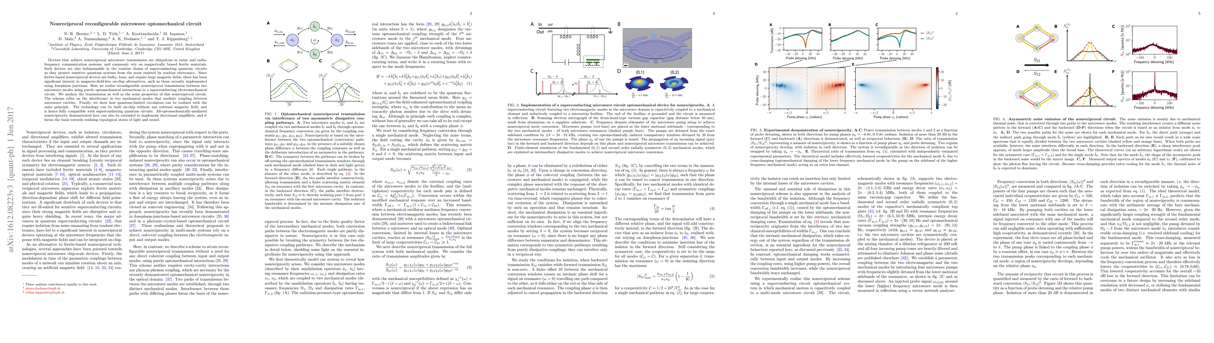 This paper demonstrates a nonreciprocal microwave transmission circuit using purely optomechanical interactions in a superconducting electromechanical circuit, enabling magnetic-field-free, on-chip alternatives to bulky ferrite-based devices. The proposed scheme shows potential for quantum-limited circulators, directional amplifiers, and topological states of light and sound.