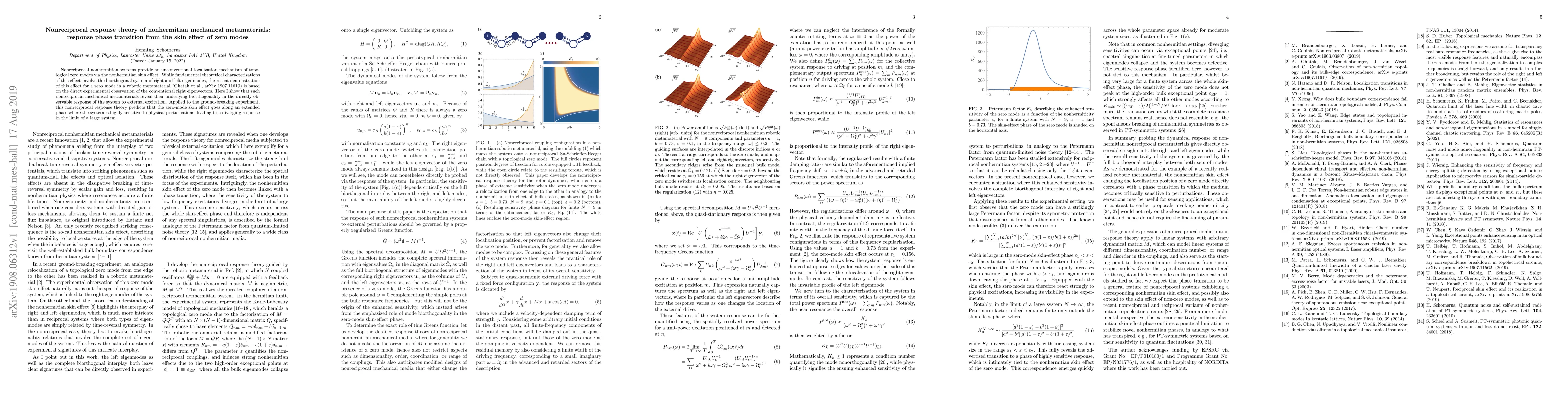 This paper explores the nonreciprocal response theory of nonhermitian mechanical metamaterials, revealing the biorthogonality of right and left eigenmodes through observable system responses. It predicts a phase transition in the zero-mode skin effect, characterized by heightened sensitivity to perturbations and a diverging response in large systems.