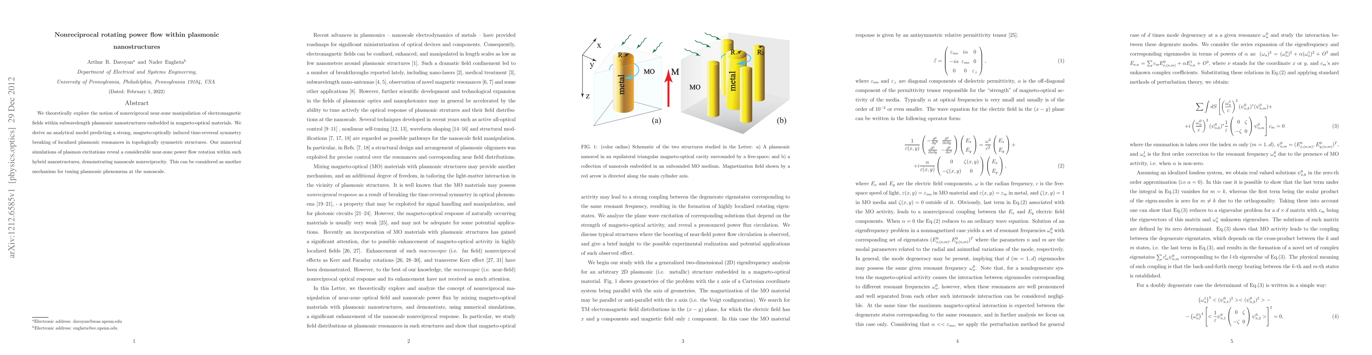 This paper theoretically investigates nonreciprocal manipulation of electromagnetic fields in plasmonic nanostructures using magneto-optical materials, revealing strong time-reversal symmetry breaking and significant near-zone power flow rotation, thus offering a new method for tuning nanoscale plasmonic effects.