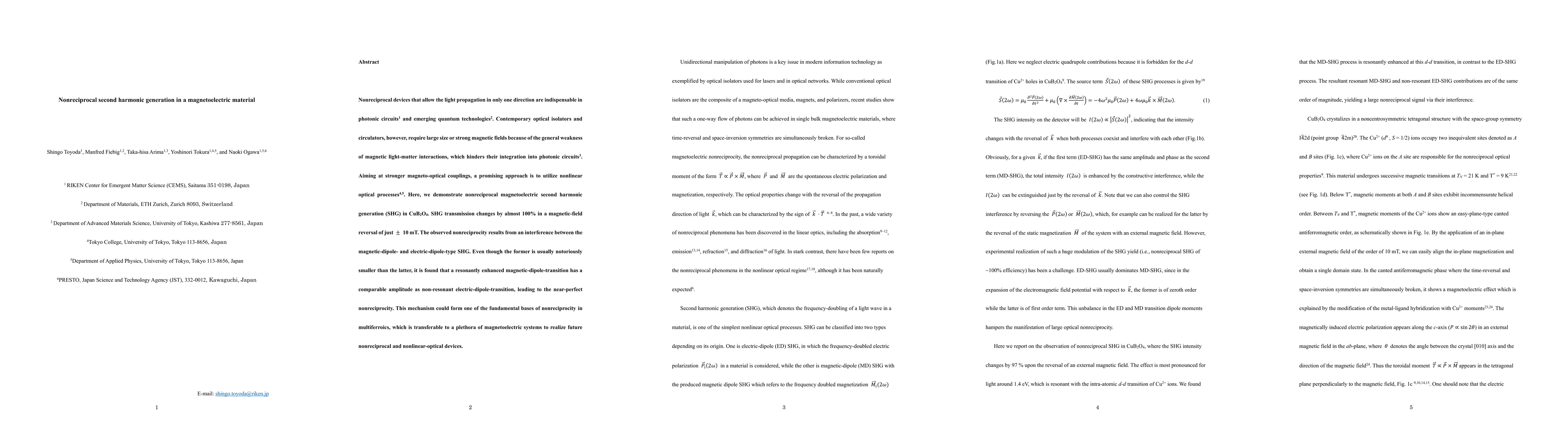 Nonreciprocal devices that allow the light propagation in only one direction are indispensable in photonic circuits and emerging quantum technologies. Contemporary optical isolators and circulators, however, require large size or strong magnetic fields because of the general weakness of magnetic light-matter interactions, which hinders their integration into photonic circuits. Aiming at stronger magneto-optical couplings, a promising approach is to utilize nonlinear optical processes. Here, we demonstrate nonreciprocal magnetoelectric second harmonic generation (SHG) in CuB2O4. SHG transmission changes by almost 100% in a magnetic-field reversal of just 10 mT. The observed nonreciprocity results from an interference between the magnetic-dipole- and electric-dipole-type SHG. Even though the former is usually notoriously smaller than the latter, it is found that a resonantly enhanced magnetic-dipole-transition has a comparable amplitude as non-resonant electric-dipole-transition, leading to the near-perfect nonreciprocity. This mechanism could form one of the fundamental bases of nonreciprocity in multiferroics, which is transferable to a plethora of magnetoelectric systems to realize future nonreciprocal and nonlinear-optical devices.