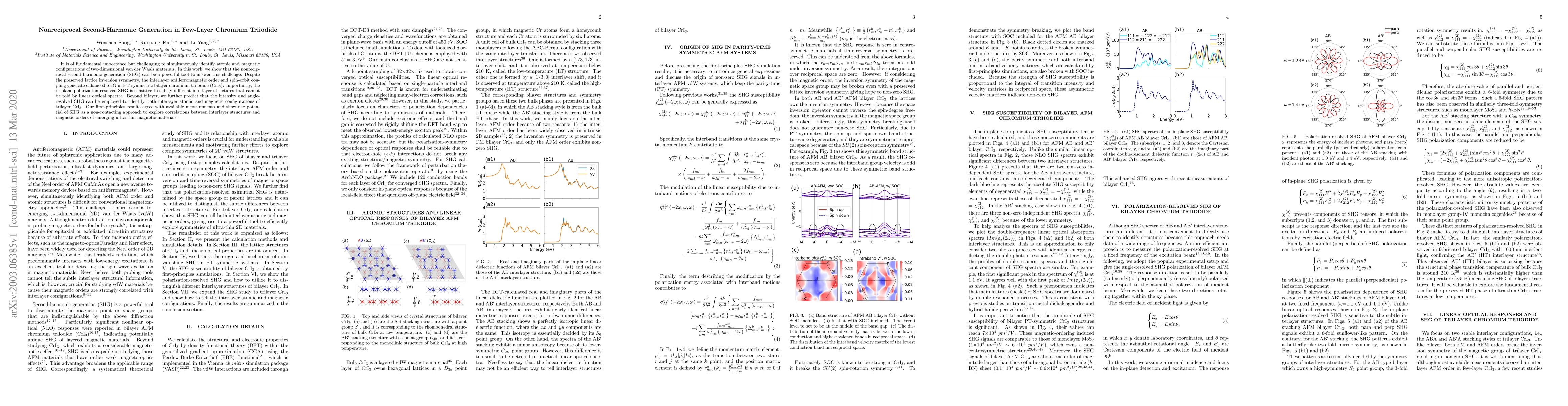 This paper demonstrates that nonreciprocal second-harmonic generation (SHG) can identify atomic and magnetic configurations in few-layer chromium triiodide, revealing interlayer structures via polarization-resolved SHG that are undetectable by linear optical spectra. The study predicts that SHG can also determine interlayer atomic and magnetic configurations in trilayer CrI3, highlighting its potential as a non-contacting method for exploring magnetic materials.