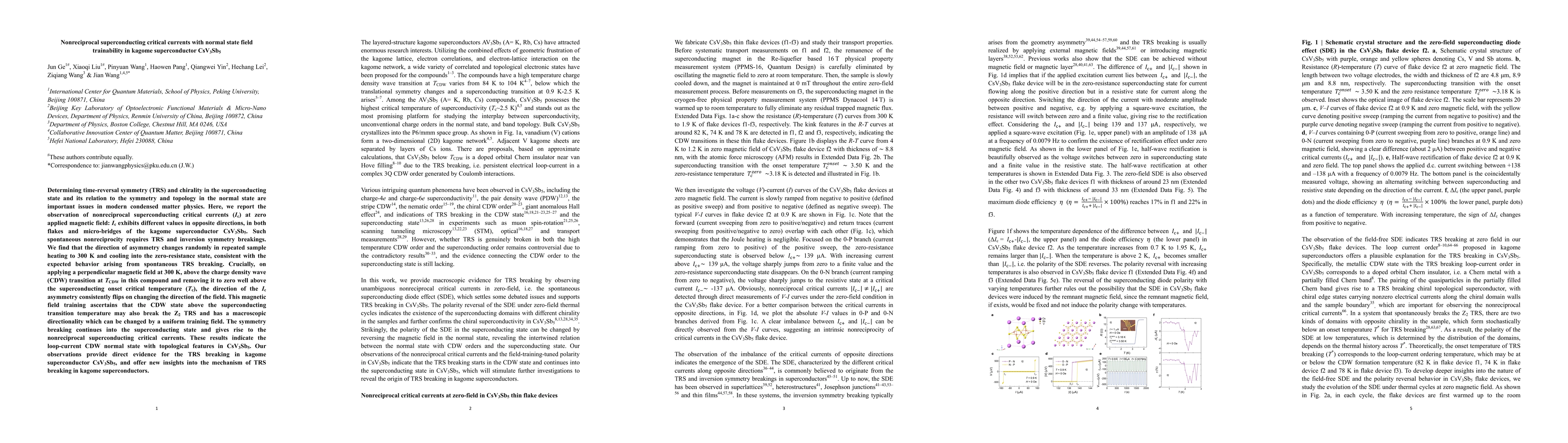 Researchers observe nonreciprocal superconducting critical currents in CsV3Sb5 that change direction with magnetic field training, indicating TRS breaking and macroscopic directionality in the CDW normal state.