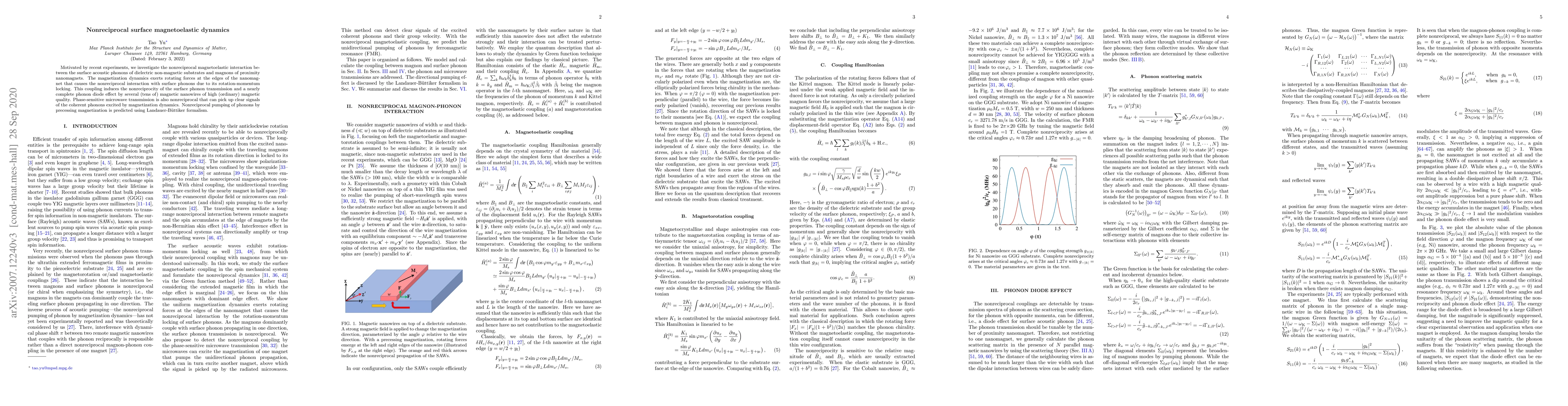 Researchers investigated nonreciprocal magnetoelastic dynamics between nanomagnets and dielectric substrates, discovering a phonon diode effect that can selectively transmit sound waves based on magnetic field orientation.