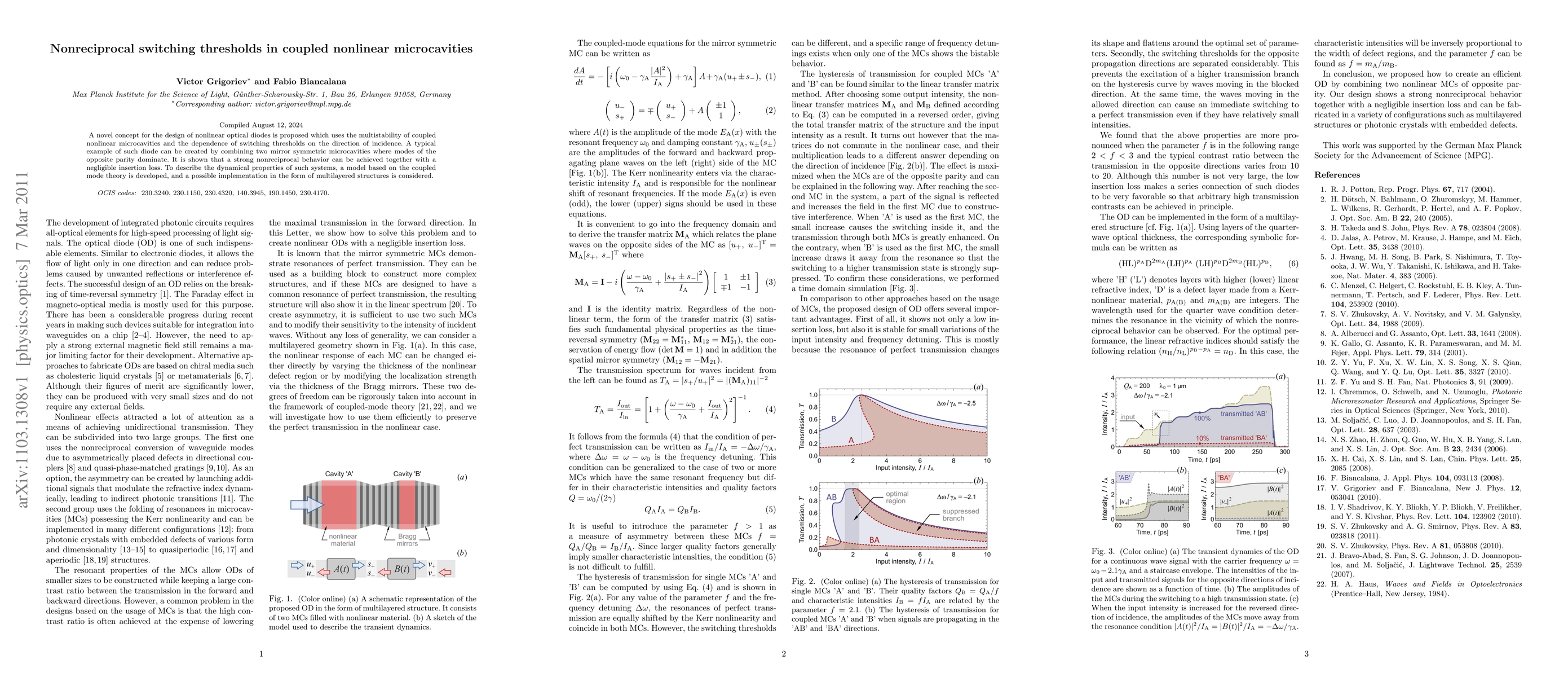This paper proposes a novel nonlinear optical diode design using coupled nonlinear microcavities that exhibit nonreciprocal switching thresholds based on the direction of light incidence, demonstrating a strong nonreciprocal behavior with minimal insertion loss. A coupled mode theory model is developed to describe the system's dynamics.