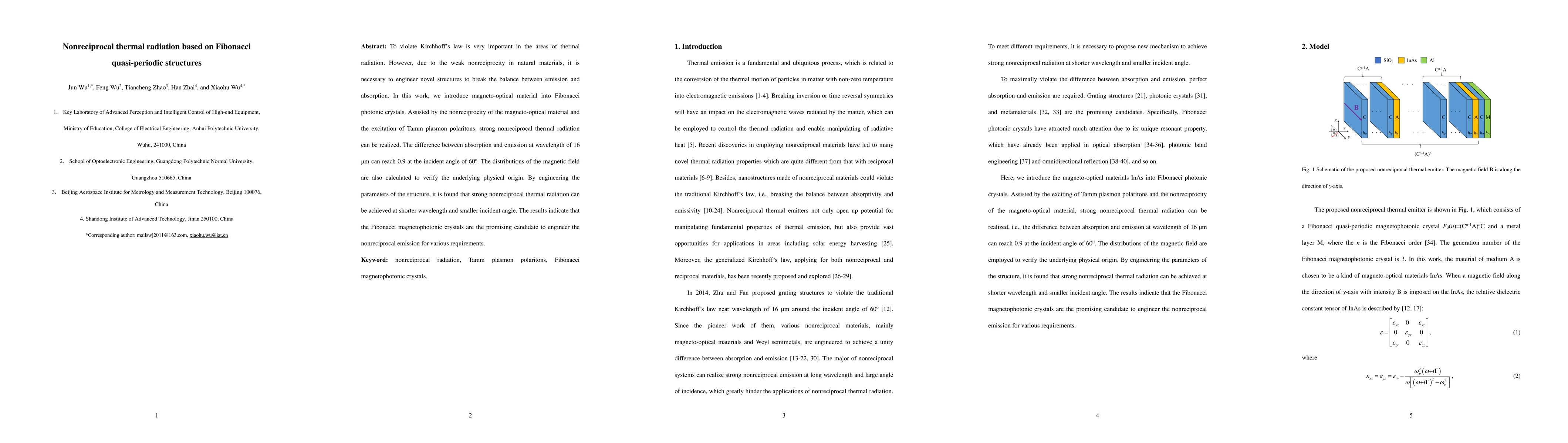 This paper demonstrates the realization of strong nonreciprocal thermal radiation using Fibonacci quasi-periodic structures with magneto-optical materials, enabling significant differences in absorption and emission, up to 0.9 at a 60° incident angle. The engineered Fibonacci magnetophotonic crystals show promise for controlling thermal radiation across various conditions.