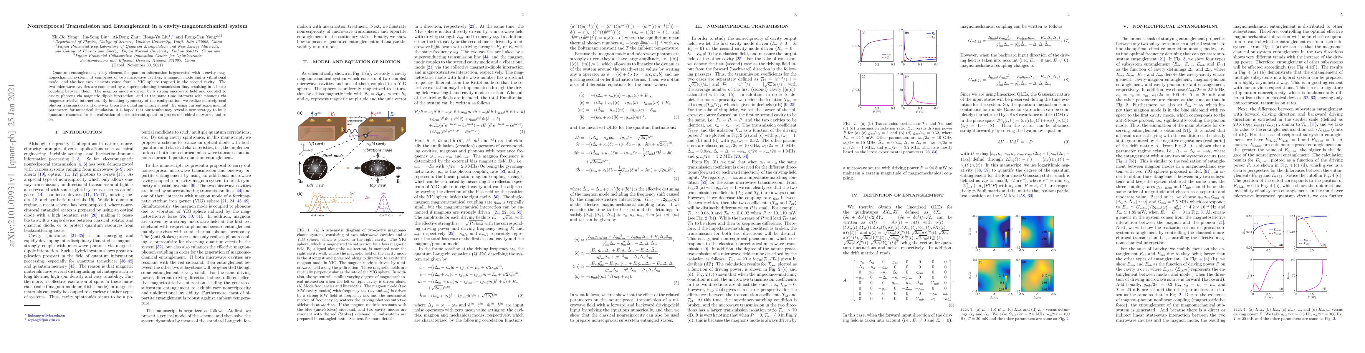 This paper explores quantum entanglement and nonreciprocal transmission in a cavity-magnomechanical system, where microwave cavities, a magnon mode, and phonons interact via magnetic and magnetostrictive couplings. By breaking symmetry, the system achieves one-way entanglement and photon transmission, potentially aiding in the development of noise-tolerant quantum processors and chiral networks.