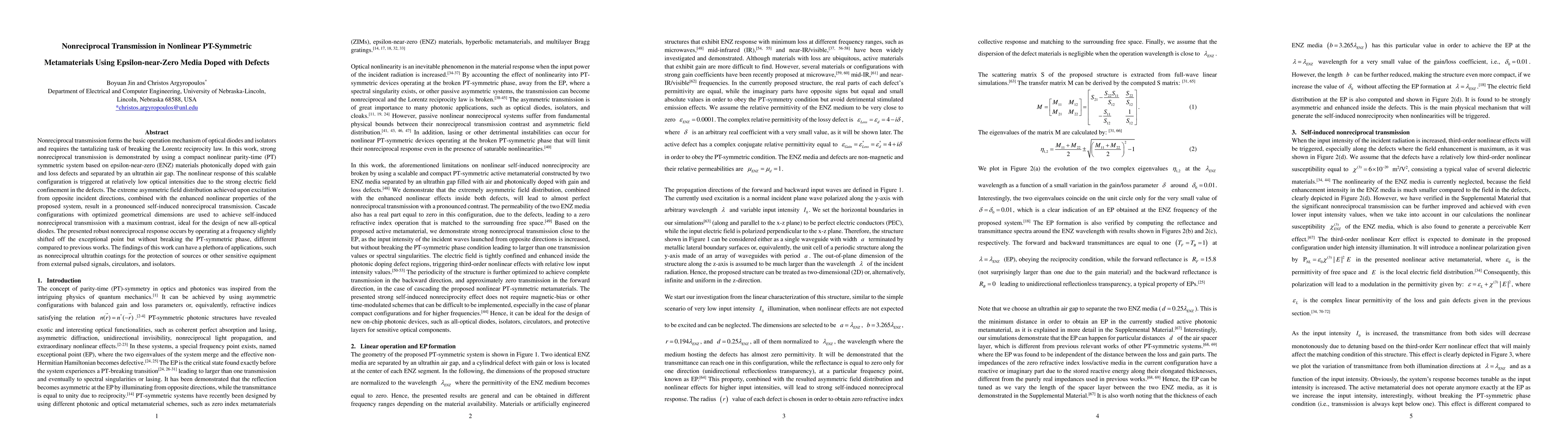 This paper demonstrates strong nonreciprocal transmission in a compact nonlinear PT-symmetric metamaterial based on epsilon-near-zero media with photonic gain and loss defects, achieving self-induced nonreciprocal transmission at low optical intensities. The findings enable the design of new all-optical diodes and have potential applications in protective coatings, circulators, and isolators.