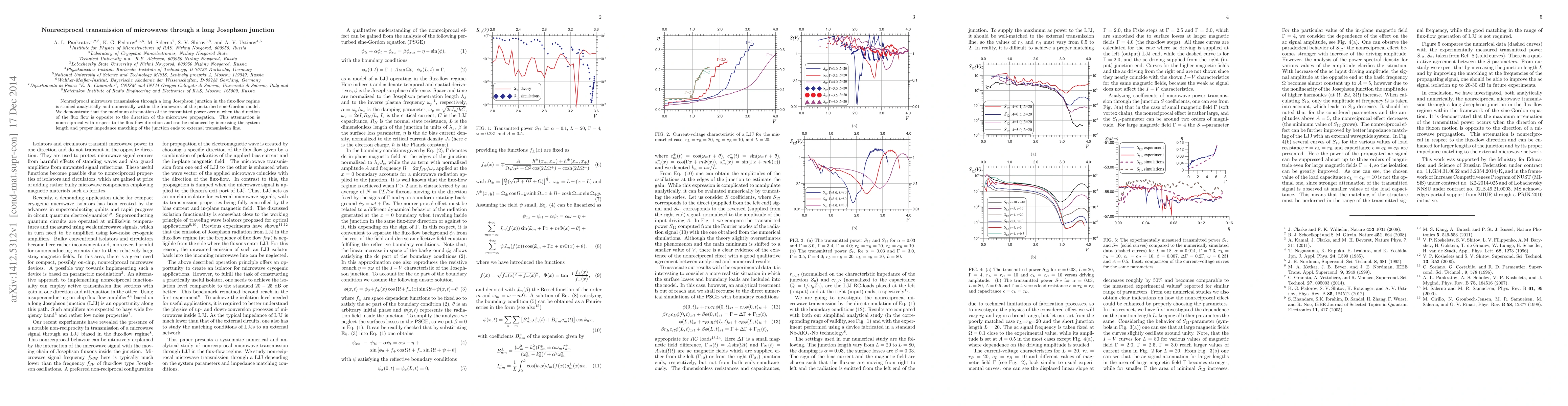 This paper investigates nonreciprocal microwave transmission through a long Josephson junction using the perturbed sine-Gordon model, showing maximum attenuation when microwave propagation opposes the flux flow, which can be enhanced by increasing junction length and impedance matching.