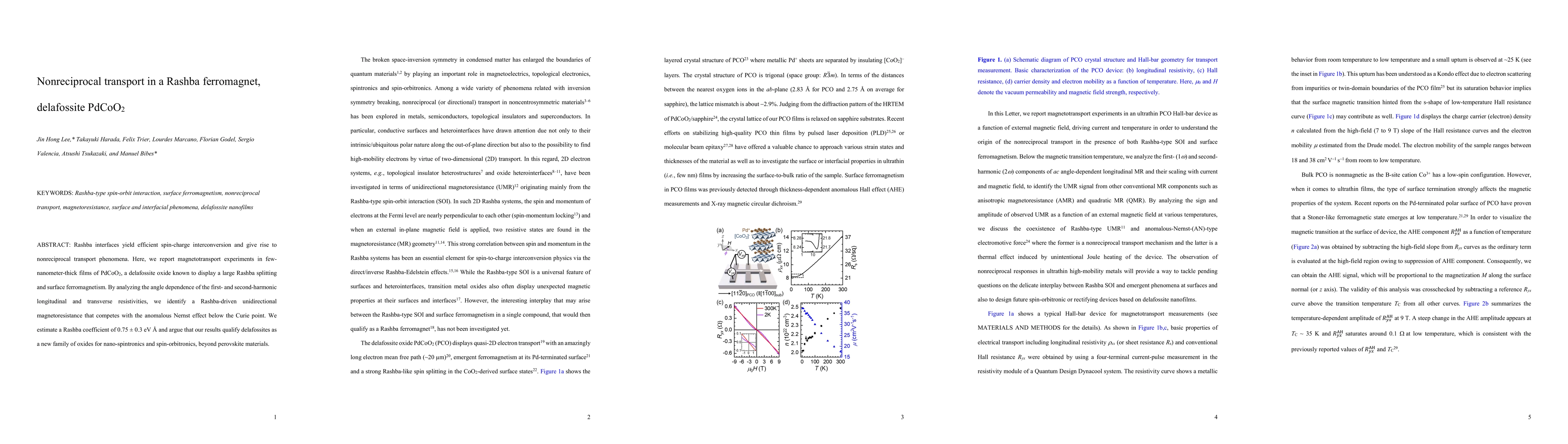 This paper investigates nonreciprocal transport in delafossite PdCoO$_2$ due to its large Rashba splitting and surface ferromagnetism, revealing a Rashba-driven unidirectional magnetoresistance that competes with the anomalous Nernst effect. The study identifies PdCoO$_2$ as a promising material for nano-spintronics and spin-orbitronics.