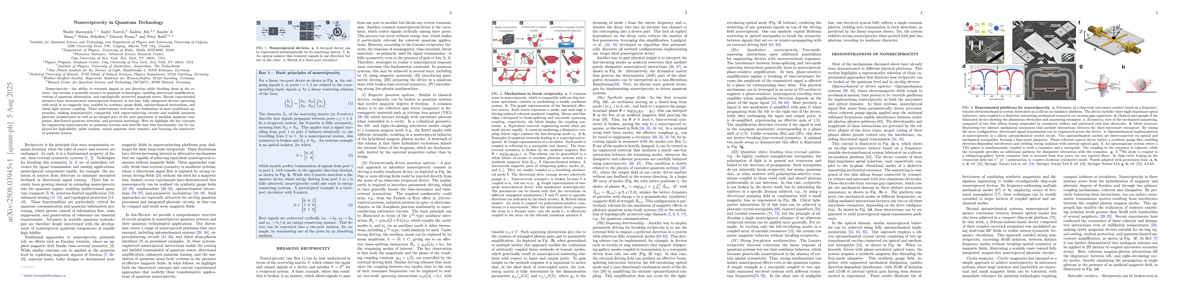 The paper discusses the significance of nonreciprocity in quantum technologies, enabling directional signal transmission crucial for quantum information processing, robust state transfer, and enhanced quantum sensor sensitivity. Recent breakthroughs demonstrate nonreciprocal behavior in low-loss, integrated devices using synthetic gauge fields, optomechanical interactions, and chiral light-matter coupling, paving the way for scalable quantum systems and next-gen quantum computers.