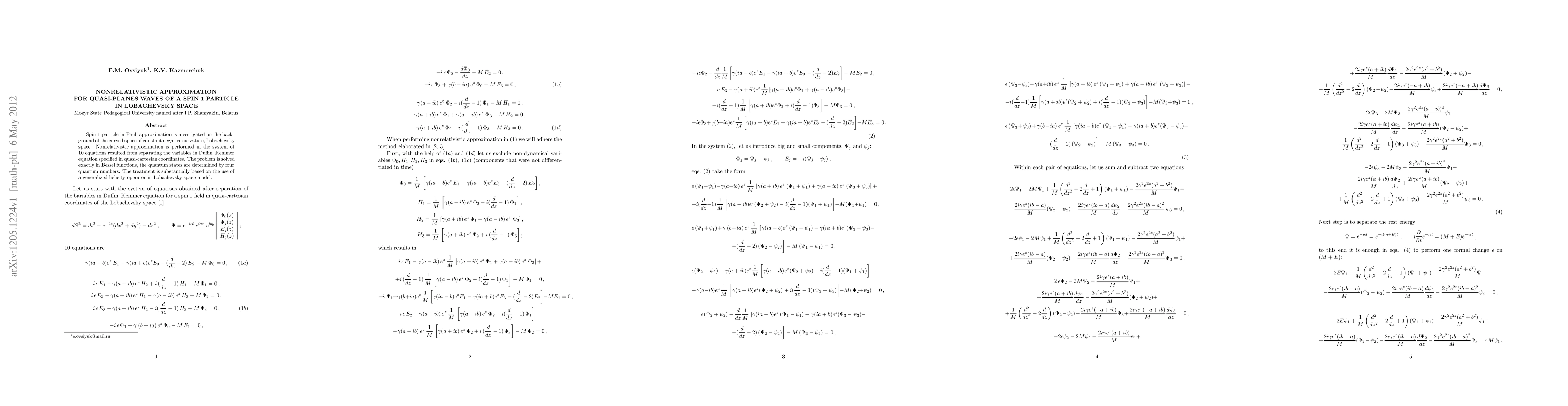 Spin 1 particle in Pauli approximation is investigated on the background of the curved space of constant negative curvature, Lobachevsky space. Nonrelativistic approximation is performed in the system of 10 equations resulted from separating the variables in Duffin-Kemmer equation specified in quasi-cartesian coordinates. The problem is solved exactly in Bessel functions, the quantum states are determined by four quantum numbers. The treatment is substantially based on the use of a generalized helicity operator in Lobachevsky space model.