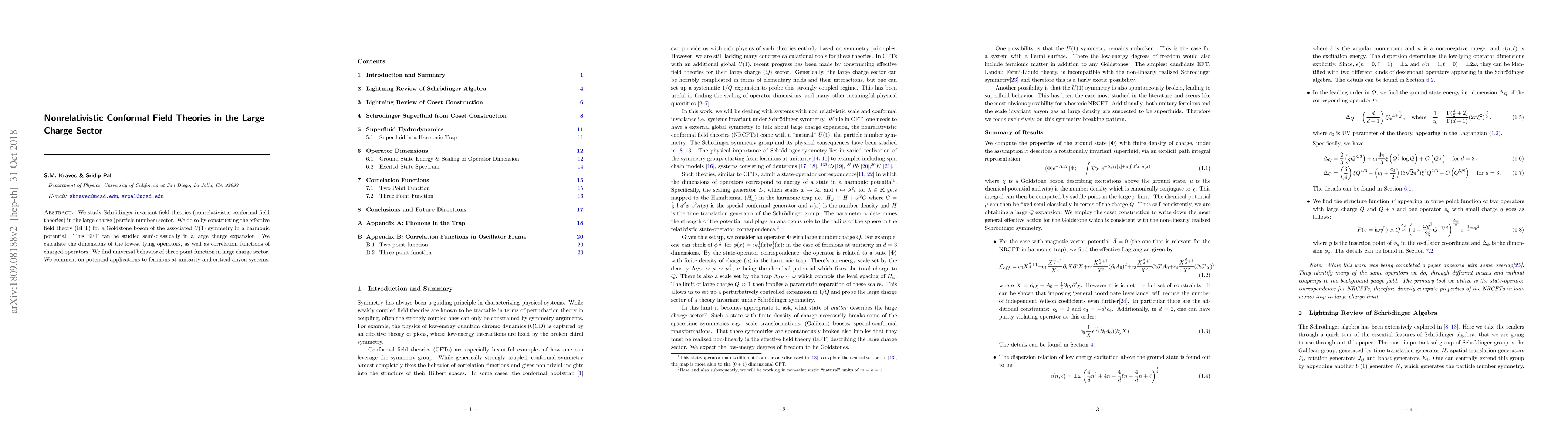 This paper explores nonrelativistic conformal field theories in the large charge sector by constructing an effective field theory for a Goldstone boson in a harmonic potential. It identifies universal behavior in three-point functions and discusses implications for fermions at unitarity and critical anyon systems.